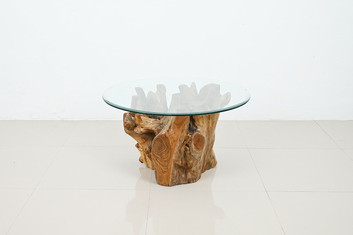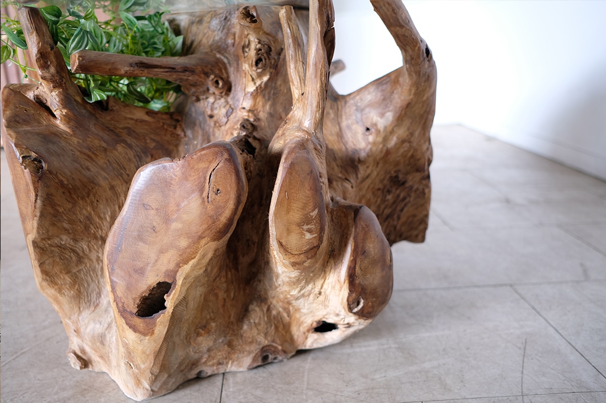 「ルーツテーブル」は、名前のとおり“ROOTS=根”を活かしたデザイン。 自然がつくり出した造形美をそのまま取り入れた特別なローテーブルです。 力強く絡み合う根のフォルムは一つとして同じものがなく、まさに天然のアート。 ガラス天板越しに見える立体感は、角度によって異なる表情を見せ、 リビングに深みと奥行きをもたらします。