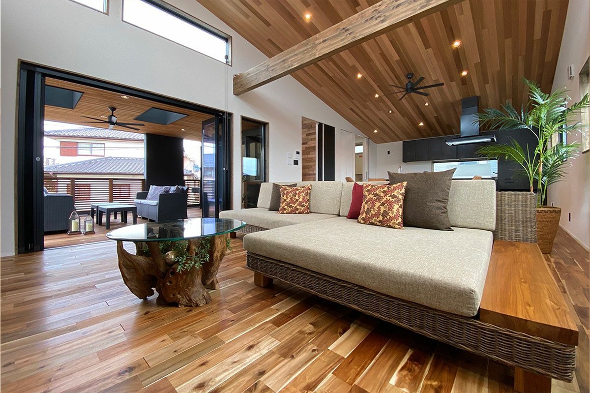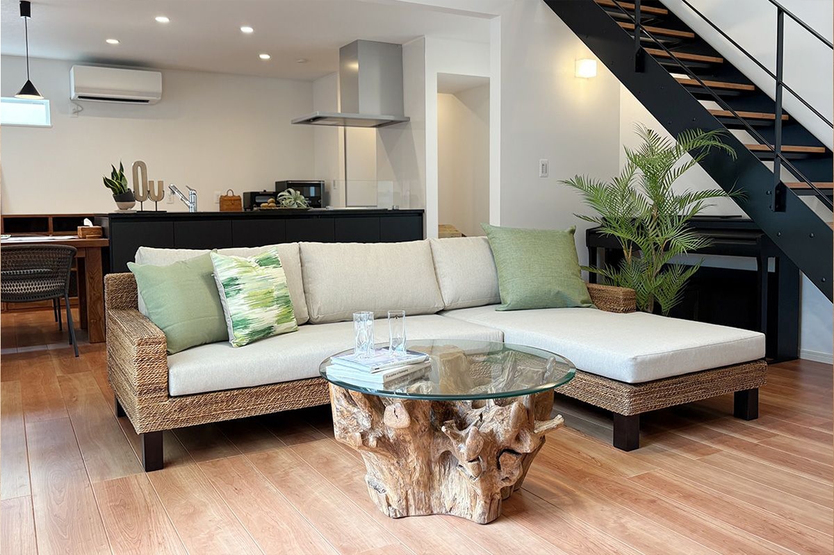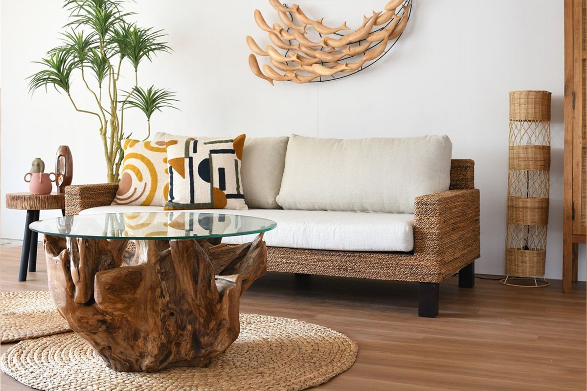 天板がガラス製なので、ソファ前の空間をすっきり広く見せてくれます。ガラス天板は、お茶やコーヒーなどをこぼしても、さっと拭くだけ。アルコールも使えるので衛生面でも安心です。アジアン素材との相性も抜群ですが、スタイルを選ばず自分色のインテリアをお楽しみいただけます。