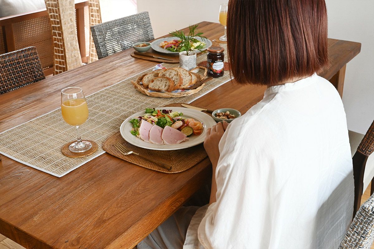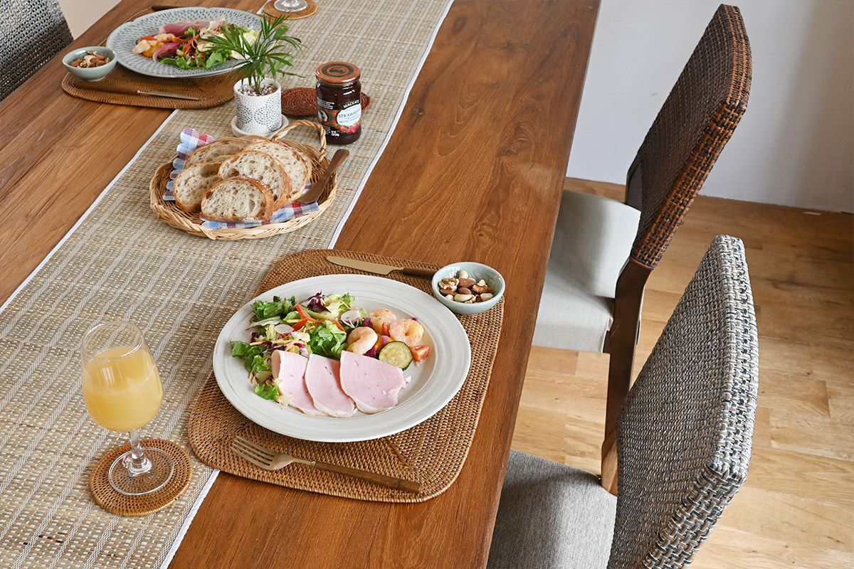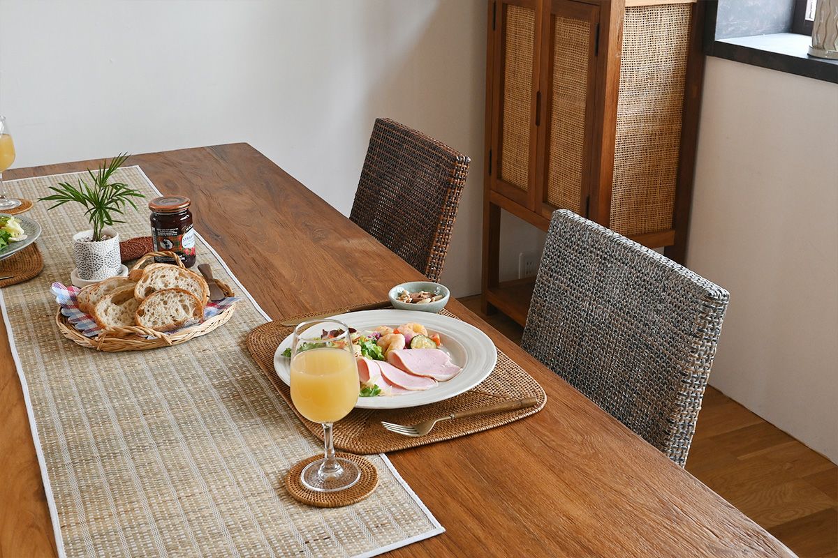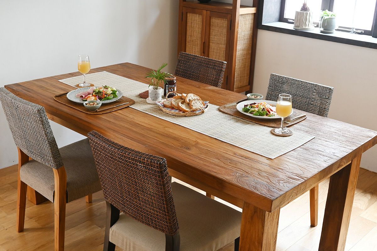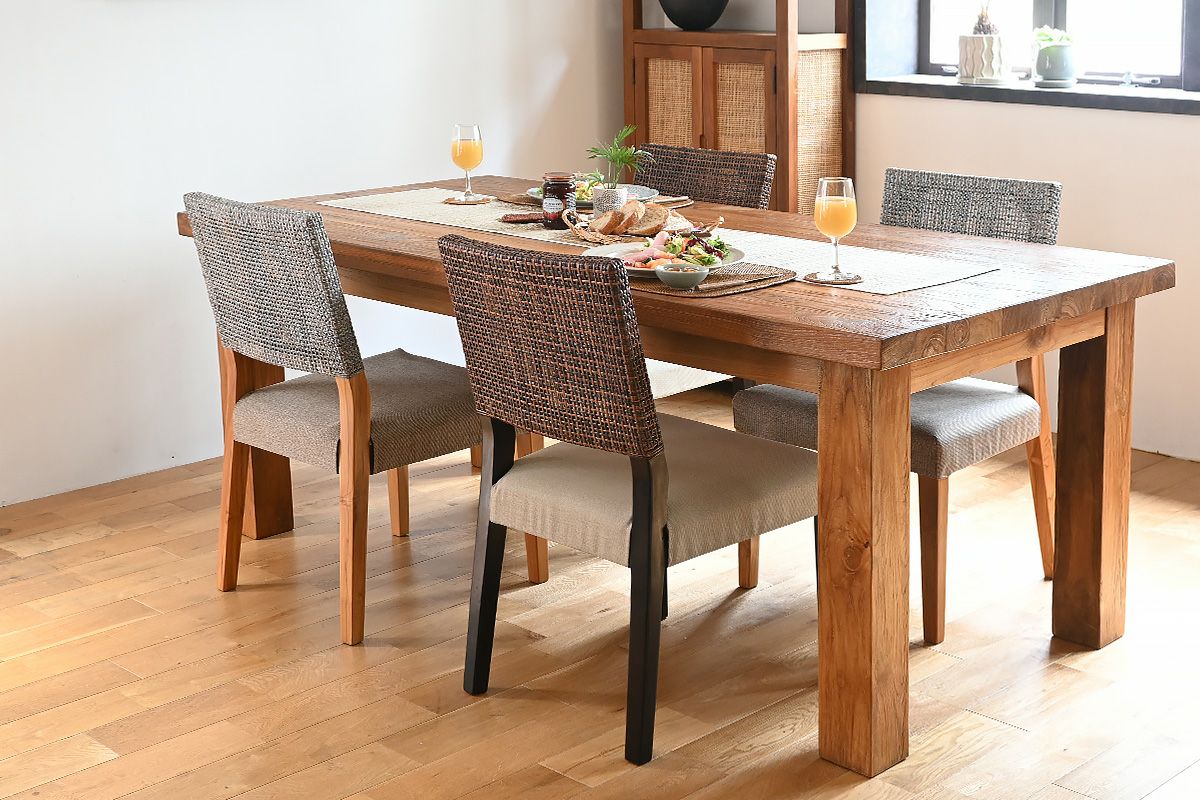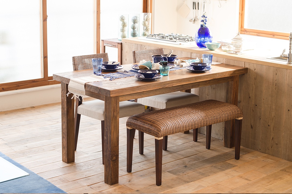 KAJAでは創業当初よりチーク材の家具を取り扱い、その強靭さ、力強い木目の表情を生かした家具作りを行ってきました。もっと安価な材にチャレンジしたこともありますが、やはりチーク材から出る高級感と重厚さには叶いません。チーク材の特徴である優れた耐水性、高い耐久性、そして経年変化する木肌の美しさ。これらをダイレクトに感じていただけるのがダイニングテーブルです。