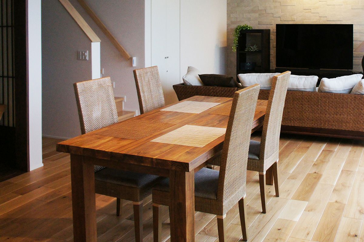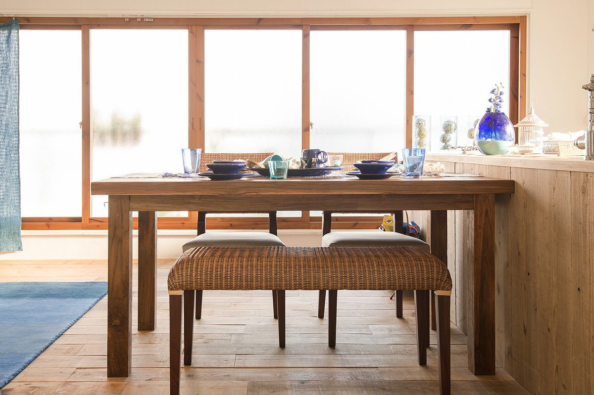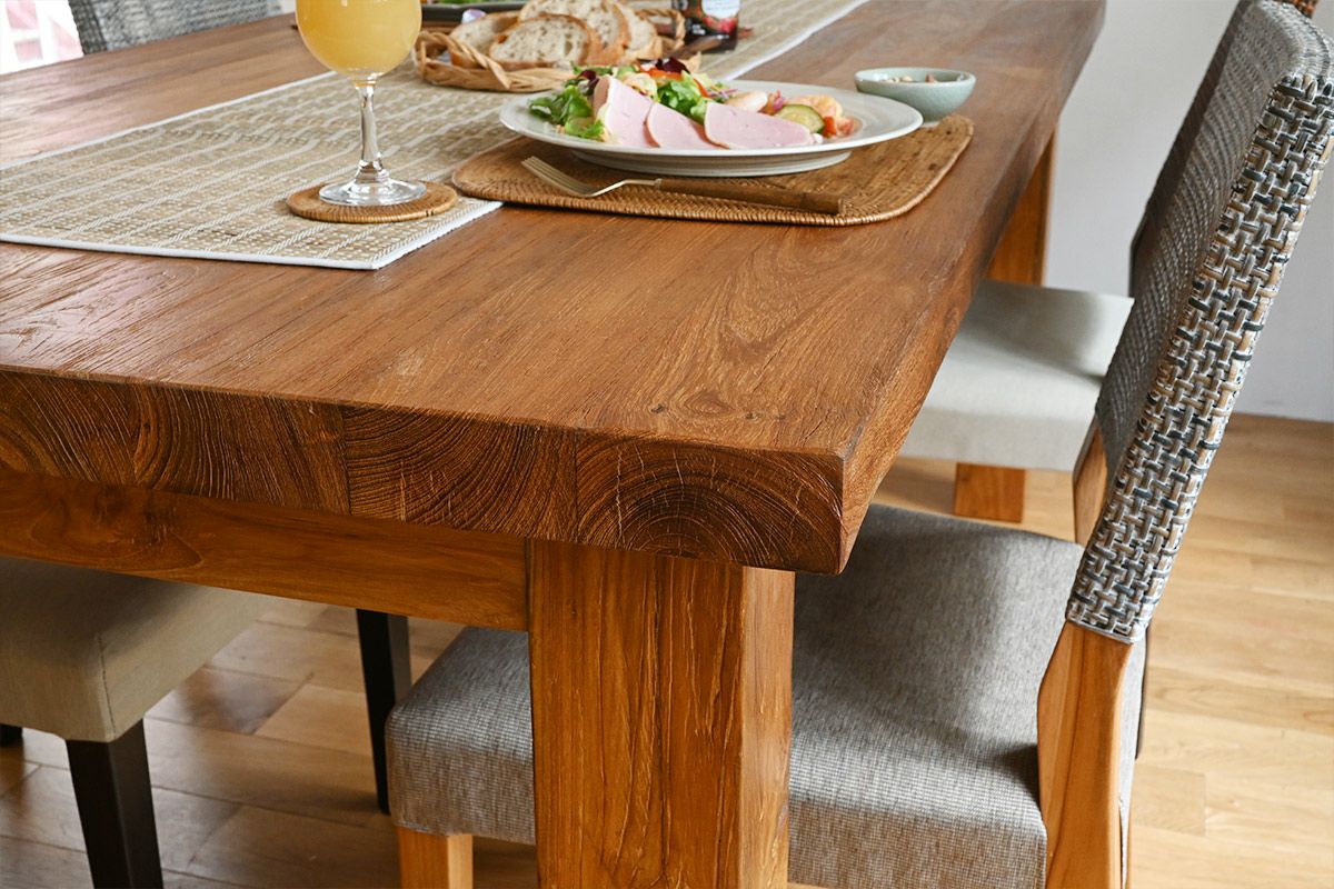 チークの無垢材。無垢材とは、簡単に言えば、丸太から切り出したそのままの板のこと。無垢材より安価な突板(つきいた)は、薄く削いだ天然木を合板などに貼り付けるため、深い傷がつくと表面が剥がれてしまったり、下地が見えてしまいます。無垢材は木そのものなので、たとえ傷がついてしまっても、表面が剥がれることはなく、削ることで修復が可能です。また使い込むうちに傷が天板に馴染んでしまうこともあり、家族の成長を共に刻むことができるのです。