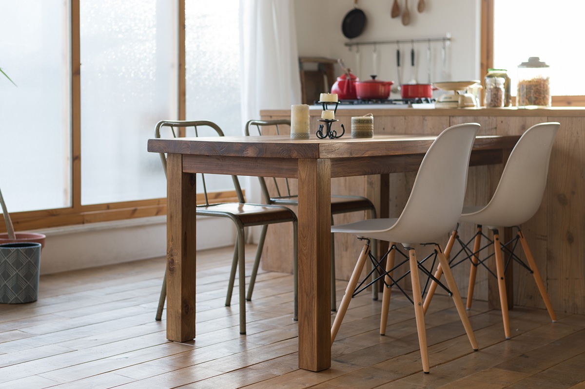 無垢材とは、簡単に言えば、丸太から切り出したそのままの板のことです。無垢材より安価な突板(つきいた)は、薄く削いだ天然木を合板などに貼り付けているため、深い傷がつくとそこが剥がれてしまったり、下地が見えてしまいます。無垢材は木そのものなので、たとえ傷がついてしまっても、表面が剥がれることはありません。それでも、無垢の板は、木目が均一ではない部分や、天板の接ぎ合わせ部分では、隣り合う部材の色味に多少の違いがあります。ひとつひとつ異なる木の表情は、天然の木材だからこそです。