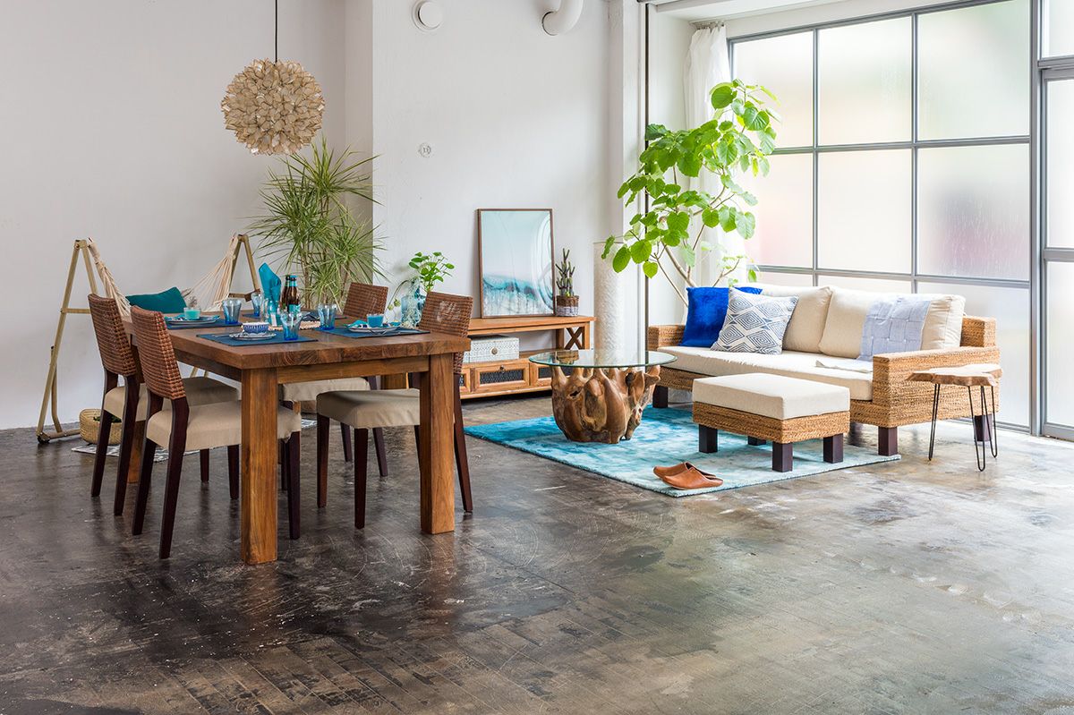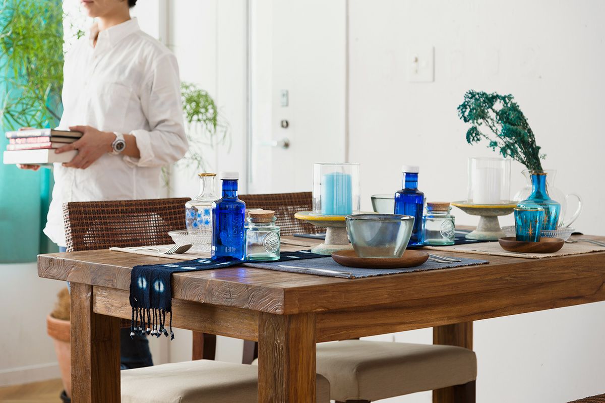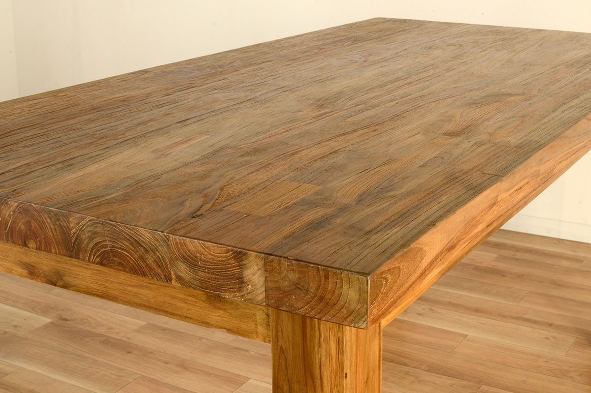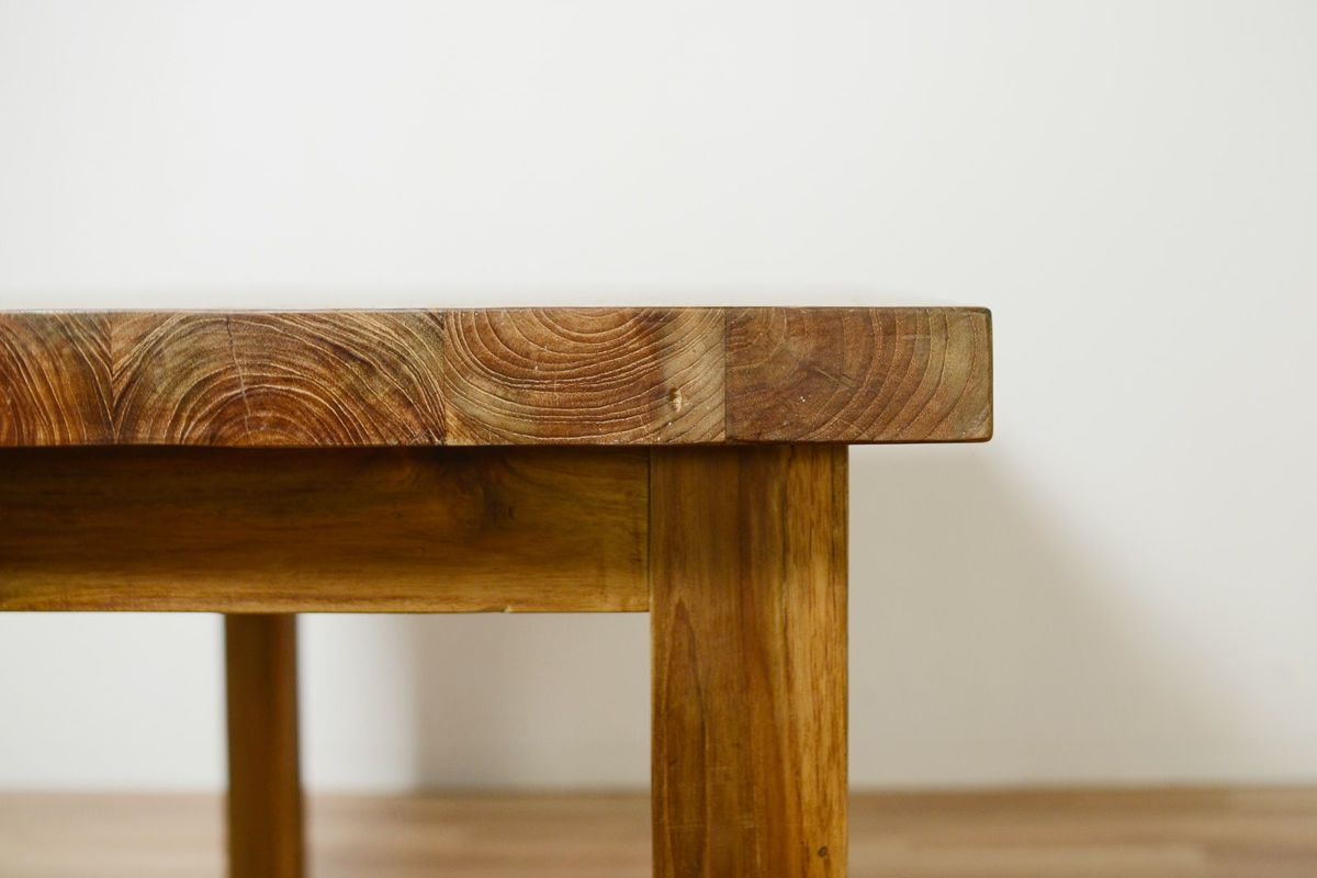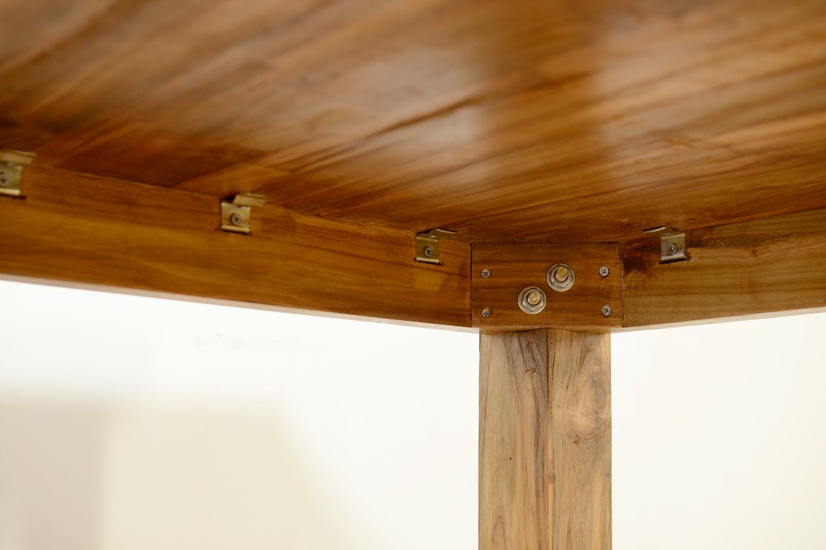 年々減少傾向にあるチーク材。KAJAでは、解体されるインドネシアの古民家を1棟買いし、優良な古材を確保しています。もともと硬く強靭なチーク材は、長年、家屋で使用されることで、木の中の含水率が落ち、ますます硬くなります。そんな古材をダイニングテーブルへと加工しています。時間を経てさらに強靭さを増したチーク古材の加工は、難しく時間はかかりますが、その分味があり、強度のあるダイニングへと仕上がります。