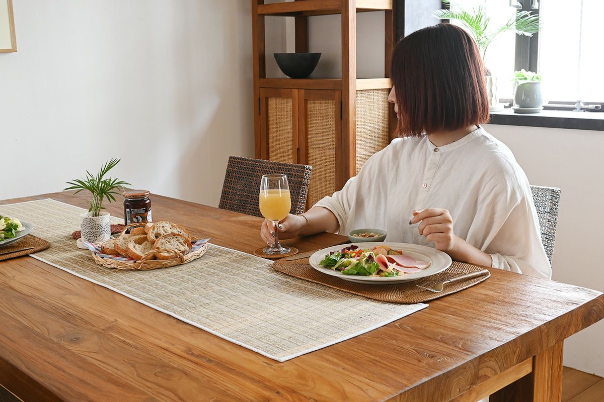 チーク材はもともと油分の多い木材のため、オイルではなく天然由来のワックスを採用。年々変わる木の表情と、その経年変化を楽しみながらお使いいただけます。ワックスには、適度な防水効果もあるため、日常使いに適しています。チーク材そのものが持つ風合いや、質感がそのまま残るワックス仕上げは、夏はひんやり、冬も適度な温度を感じられます。ただ、大量の水滴、熱には弱いので、お食事の際は、コースターやランチョンマットのご使用をおすすめします。普段のお手入れは固く絞った布巾で行い、定期的に家具用のワックスにてお手入れしていただくと、防水効果も持続します。