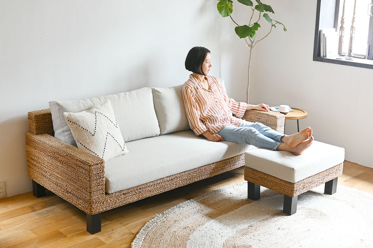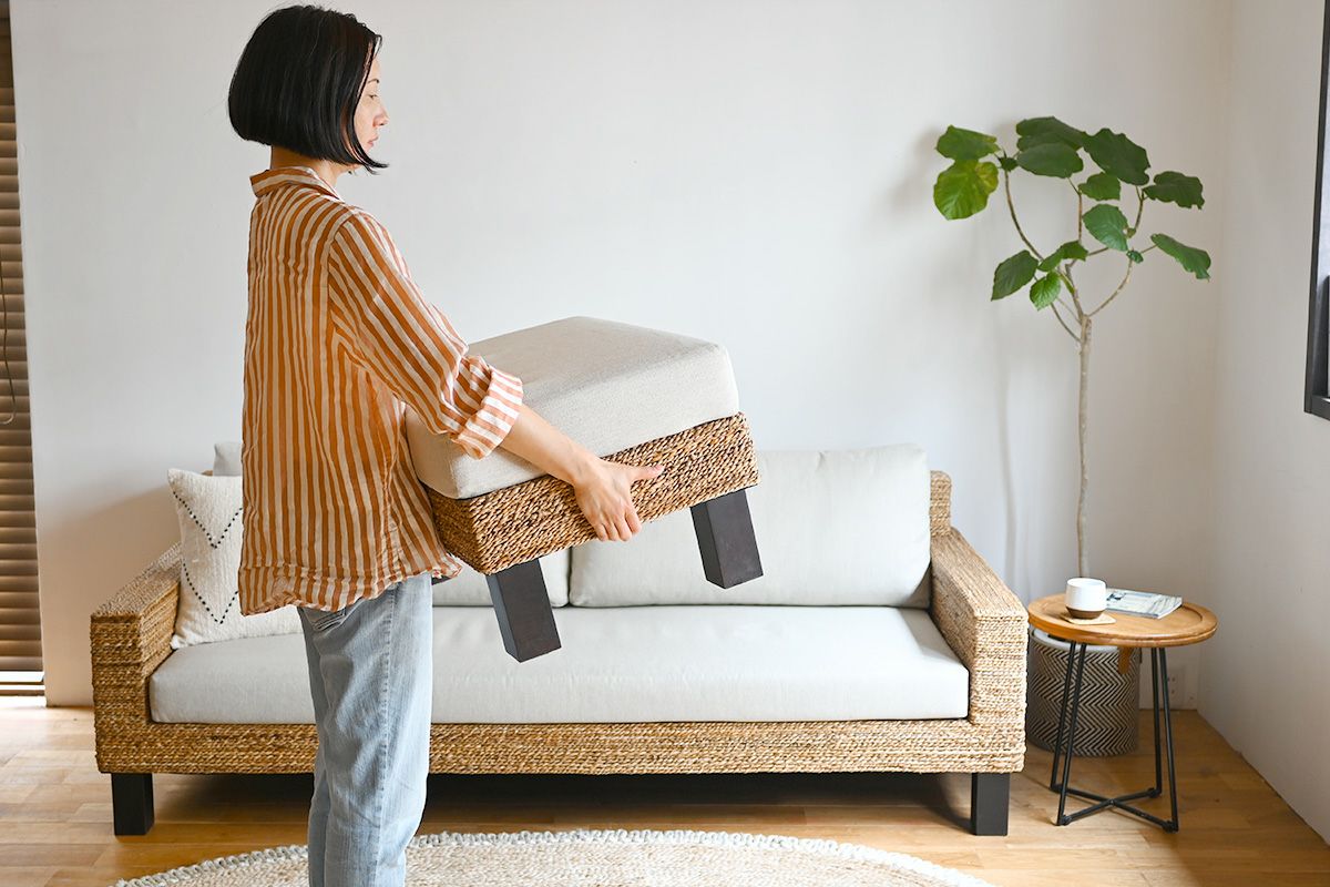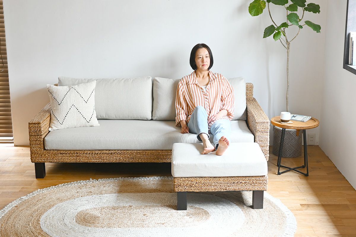 Sサイズは、コンパクトなお部屋にも置きやすく、気軽に取り入れられます。座面クッションと土台はマジックテープがついているため、ずれる心配もありません。下の画像は、「FARGO/オミソファ」3人掛け(幅195cm)、2人掛け(幅150cm)に合わせた場合です。