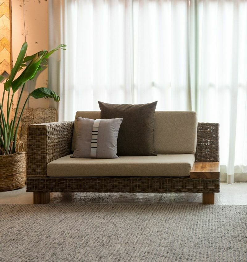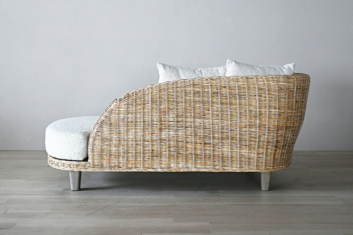 ラタン素材のナチュラルな雰囲気を存分に活かしたリゾートライクなマーメイドソファ。背もたれの柔らかなラインが特徴的なデザインで、優しい雰囲気がお部屋全体に広がります。シートと同じファブリックの2つのクッションが付属します。背もたれ部分に置いて調整できるので、どんな姿勢でも居心地良く過ごせます。