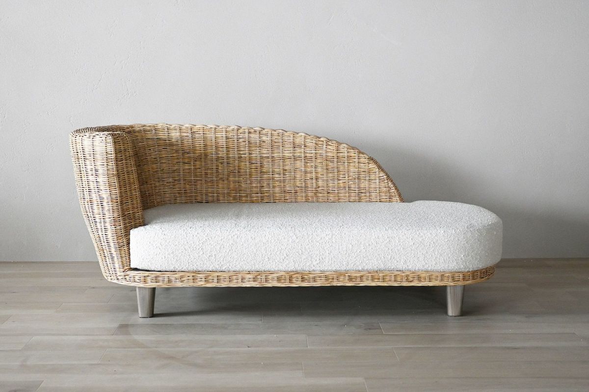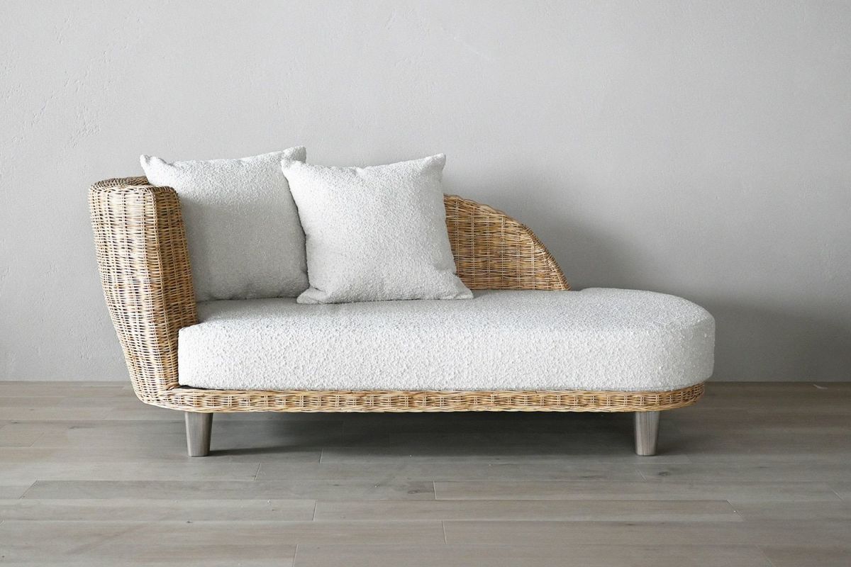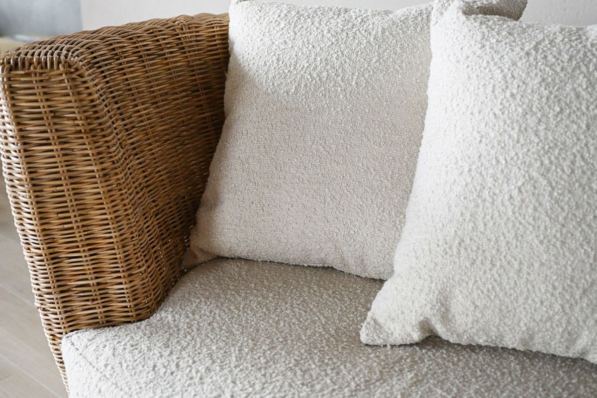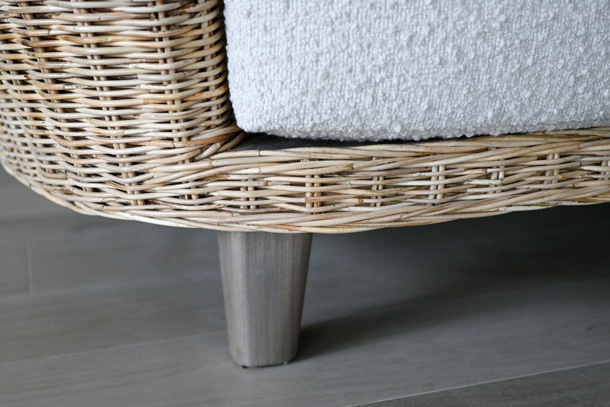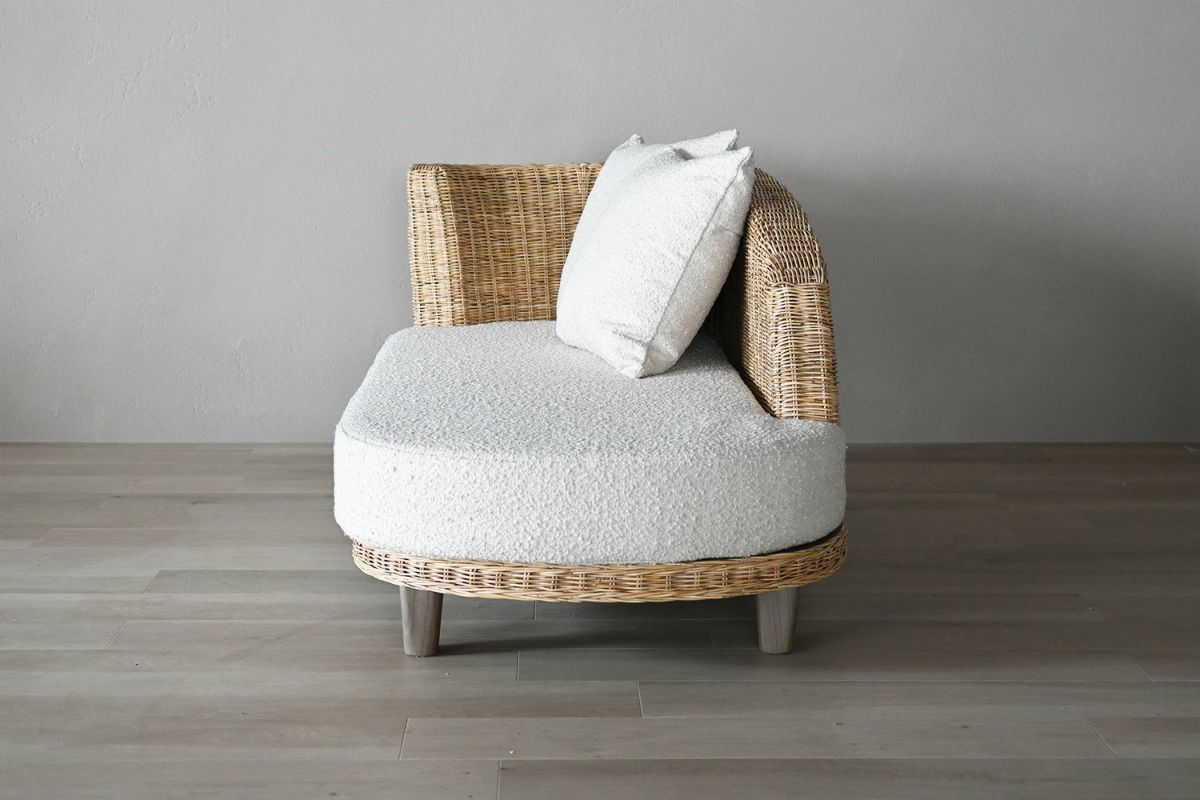 ニュートラルな色合いのラタンはお部屋に馴染みやすく、お部屋に適度な明るさをプラスしてくれます。座面の白いファブリックはブークレ素材。少し立体感のあるモコモコした柔らかい肌触りです。