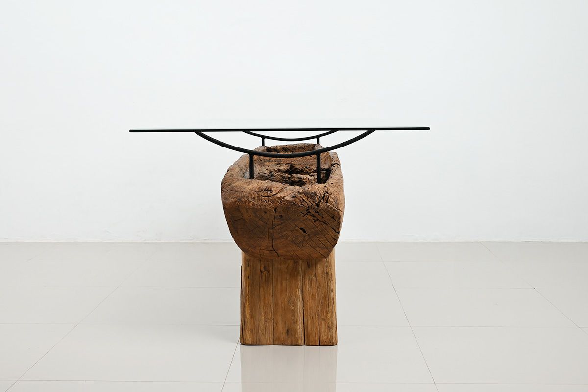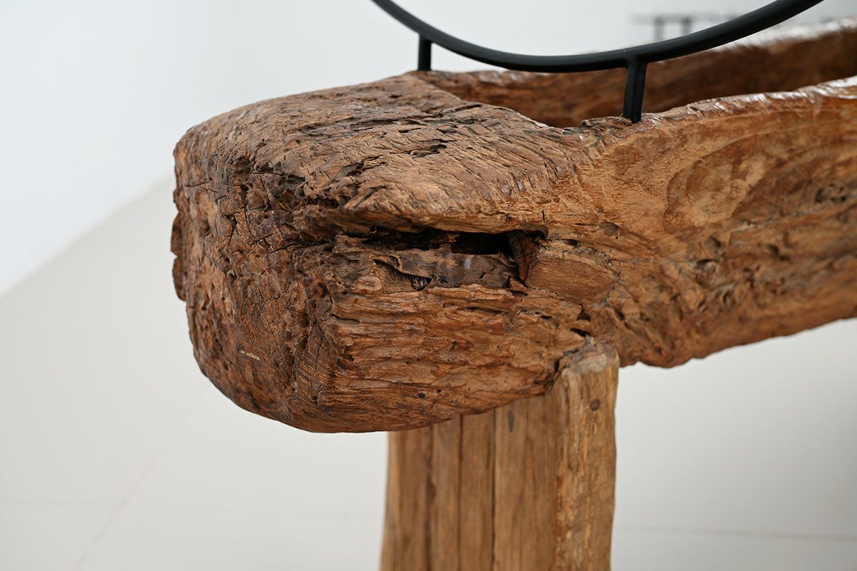 古木の土台は、おおよそ50年から100年前にジャワ島で高床式住居の食物庫の一部や、臼として使われていたチーク材で、今では現地でもなかなか手に入らない素材です。 ディスプレイスペースとして活用できる“くぼみ”は、実はスパイスをすり潰したり、家畜の餌を入れたりしていたものなのだと言われています。古木は、現地の人々の暮らしに溶け込み、役割をしっかりと果たしてきた働き者。そんなストーリーを感じられる素材で作られた家具だからこそ、再び暮らしの中に招き入れ、愛着を感じながら使っていただければ嬉しく思います。