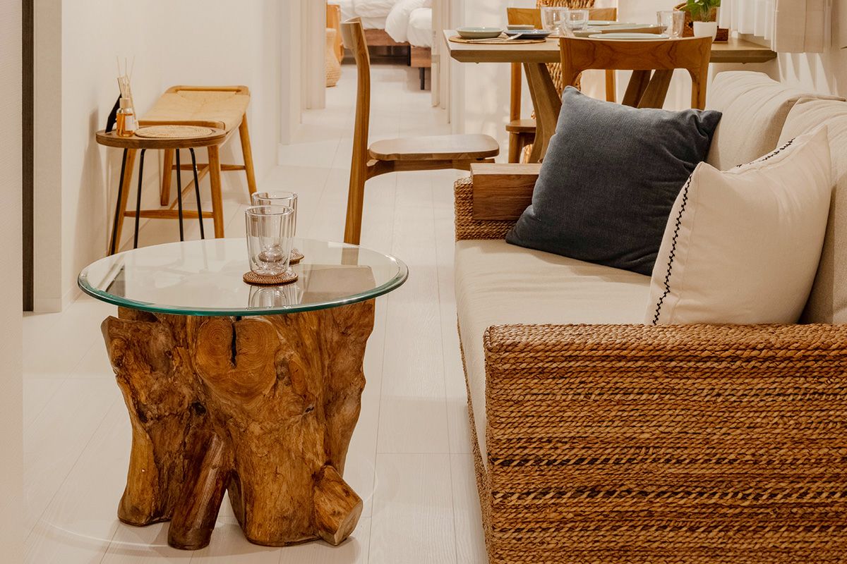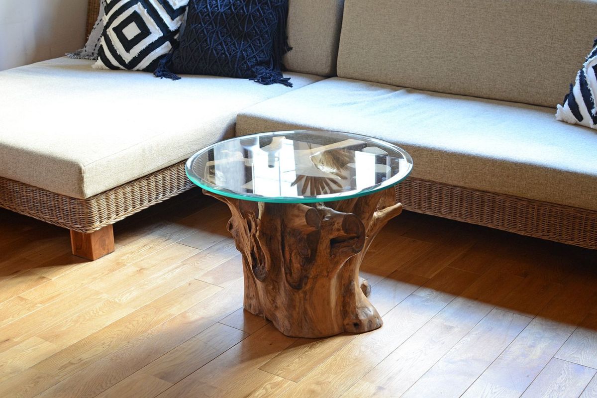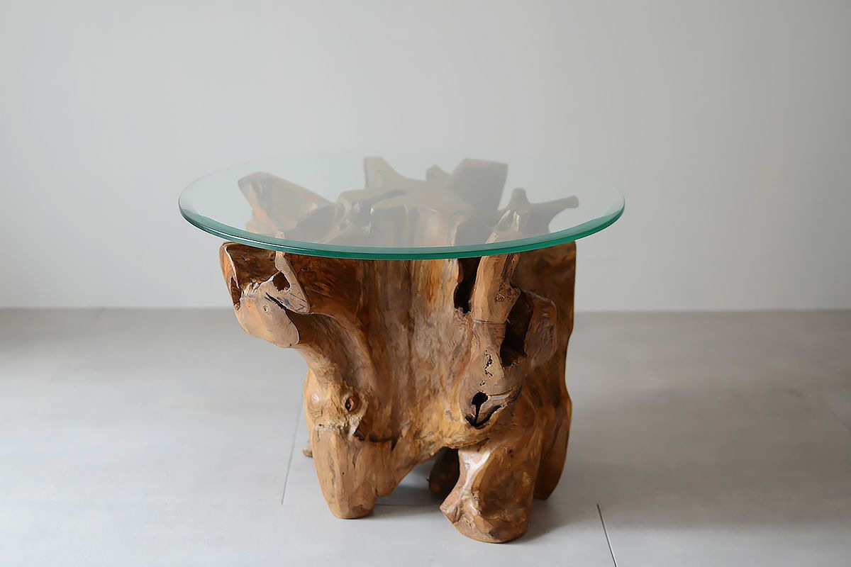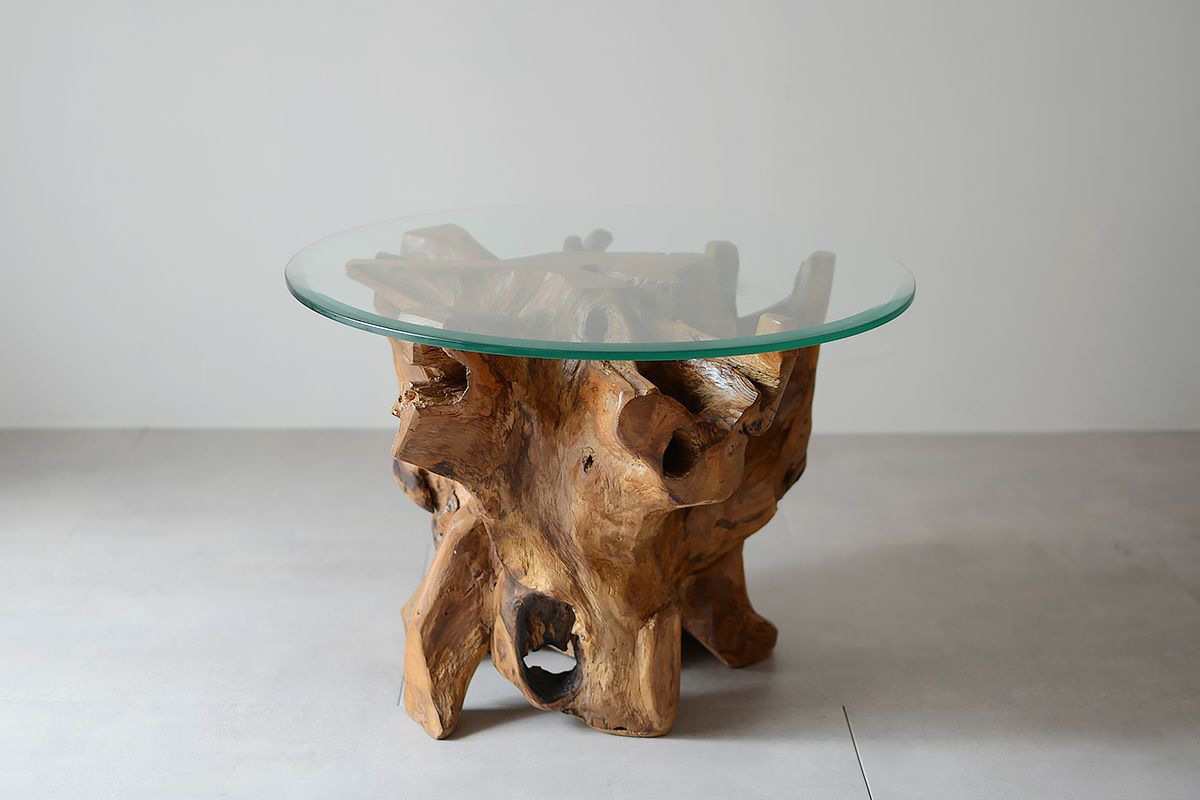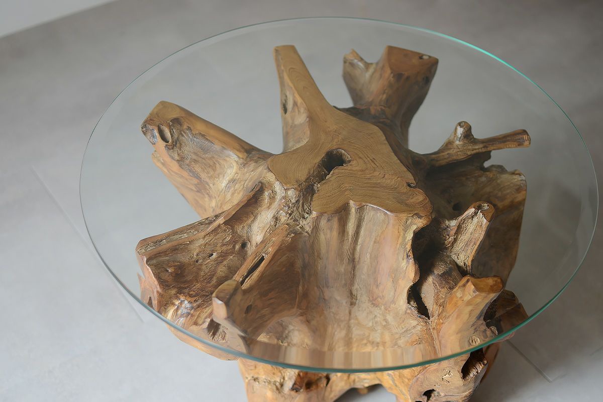 「ルーツテーブル」は、名前のとおり“ROOTS=根”を活かしたデザイン。 自然がつくり出した造形美をそのまま取り入れた特別なローテーブルです。 力強く絡み合う根のフォルムは一つとして同じものがなく、まさに天然のアート。 ガラス天板越しに見える立体感は、角度によって異なる表情を見せ、 リビングに深みと奥行きをもたらします。
