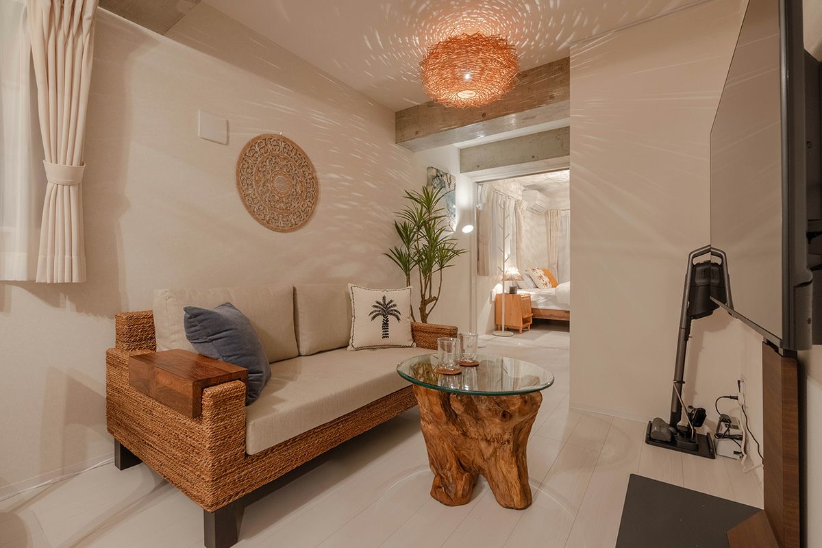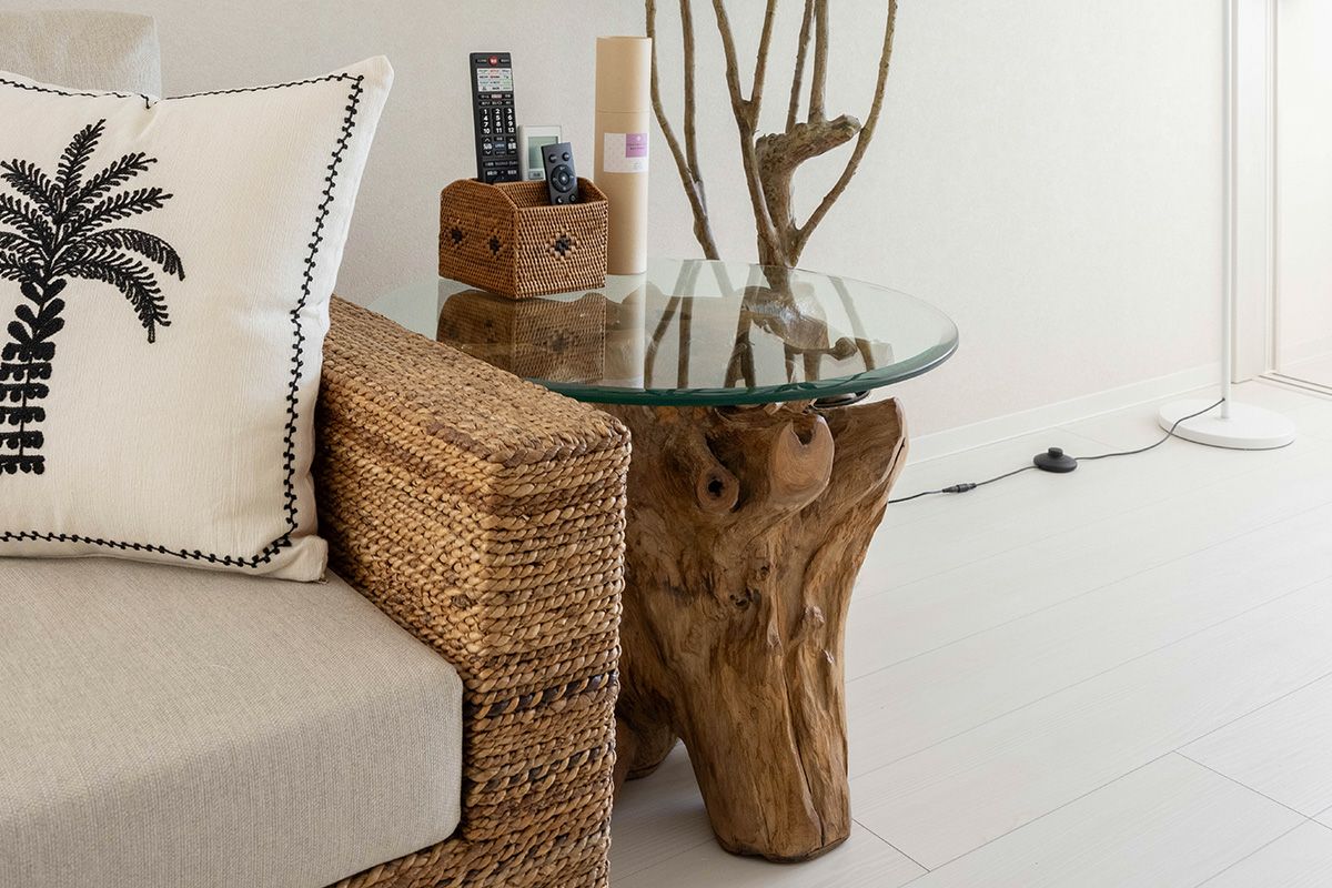 天板がガラス製なので、ソファ前の空間をすっきり広く見せてくれます。ガラス天板は、お茶やコーヒーなどをこぼしても、さっと拭くだけ。アルコールも使えるので衛生面でも安心です。アジアン素材との相性も抜群ですが、スタイルを選ばず自分色のインテリアをお楽しみいただけます。
