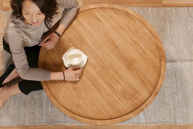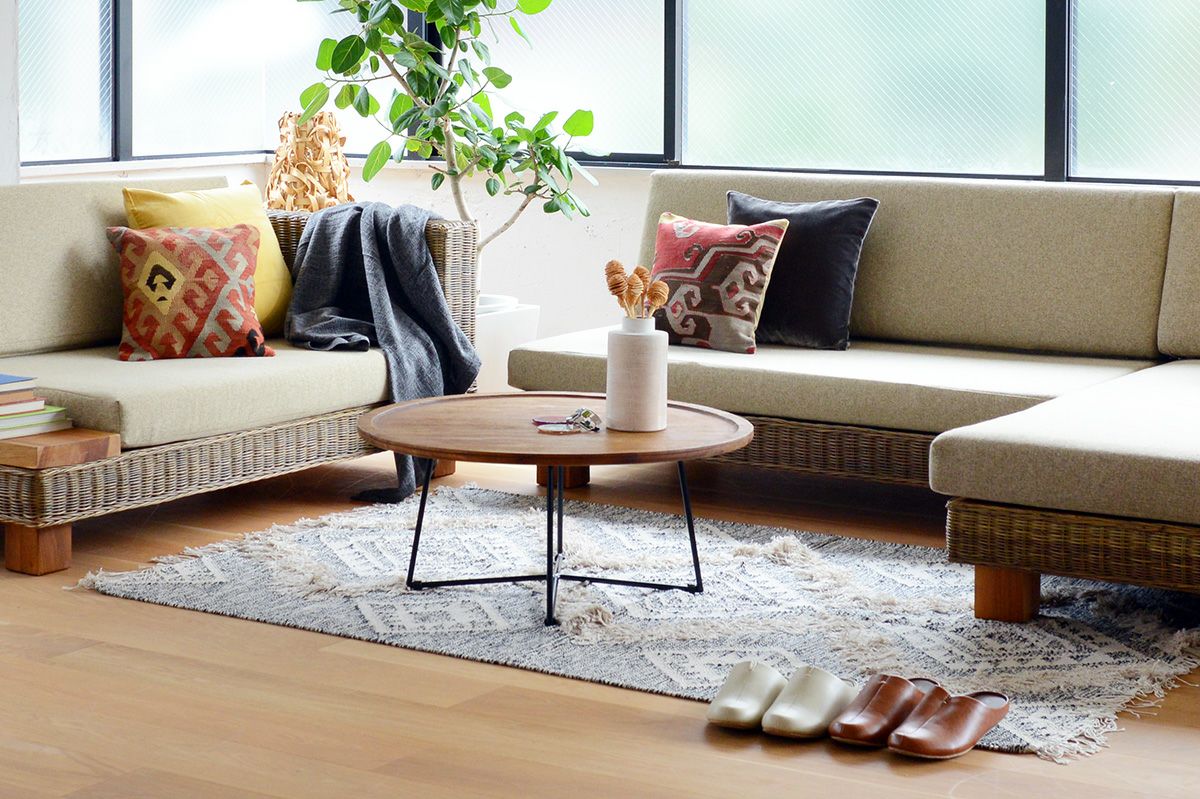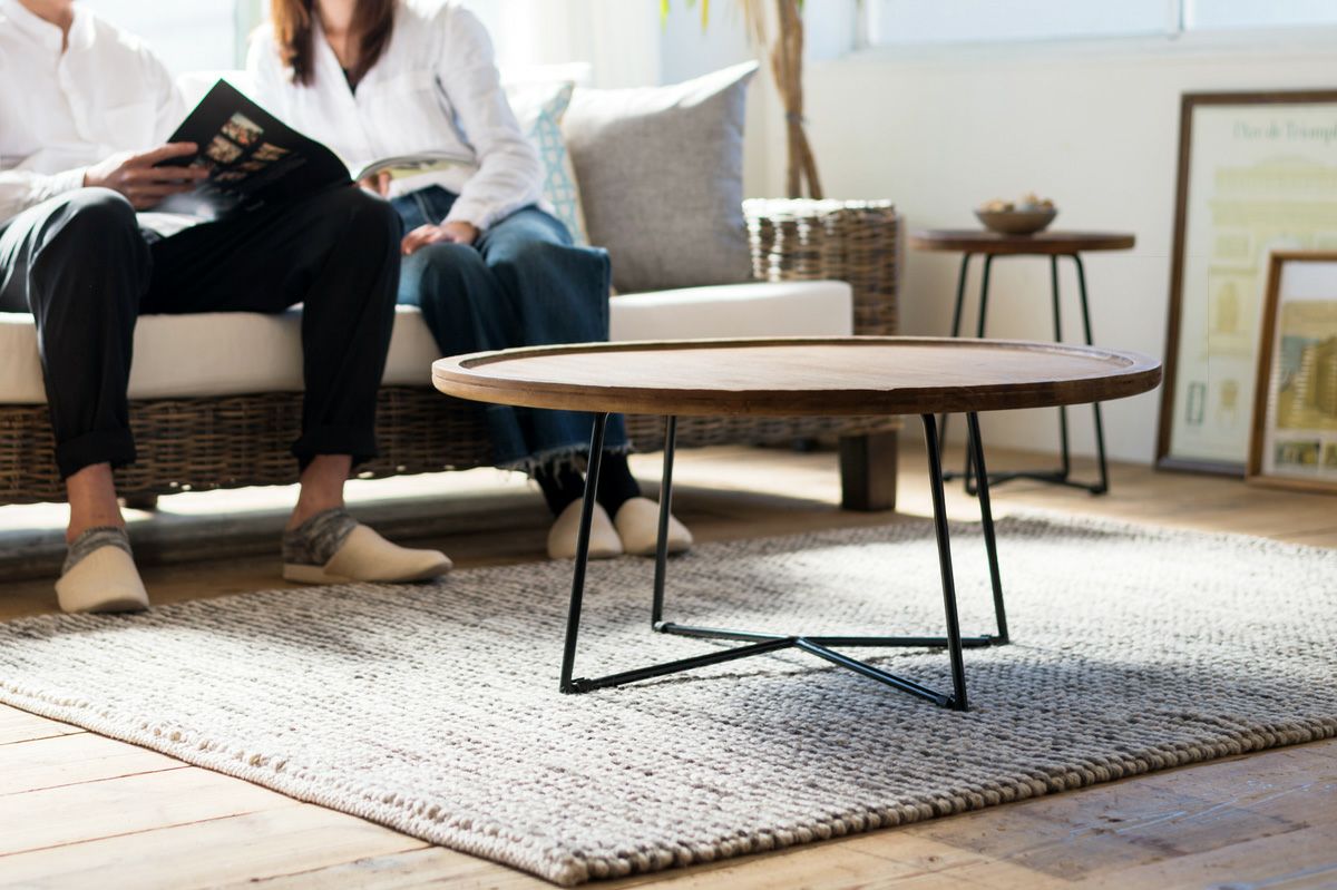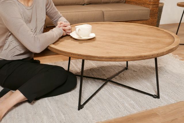 直径80cmのシンプルな天板は、2人で食事をとるにも、ノートパソコンで作業するにも、ゆとりのサイズ。ラウンド型のテーブルは、角がなくリビングの動線をすっきりと取ることができます。ソファにあわせても、そのまま床に座って座卓として使うにもおすすめです。