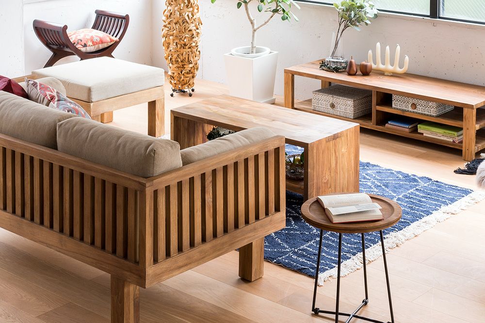 適度に重厚感のあるチーク材をナチュラルカラーで仕上げることで、やさしく柔らかな心地よさを感じさせます。上質な素材に、かしこまりすぎないカジュアルさが、うまく組合わさったローテーブルに仕上がりました。