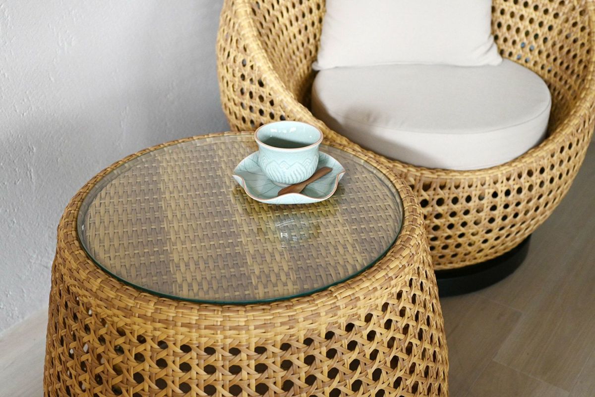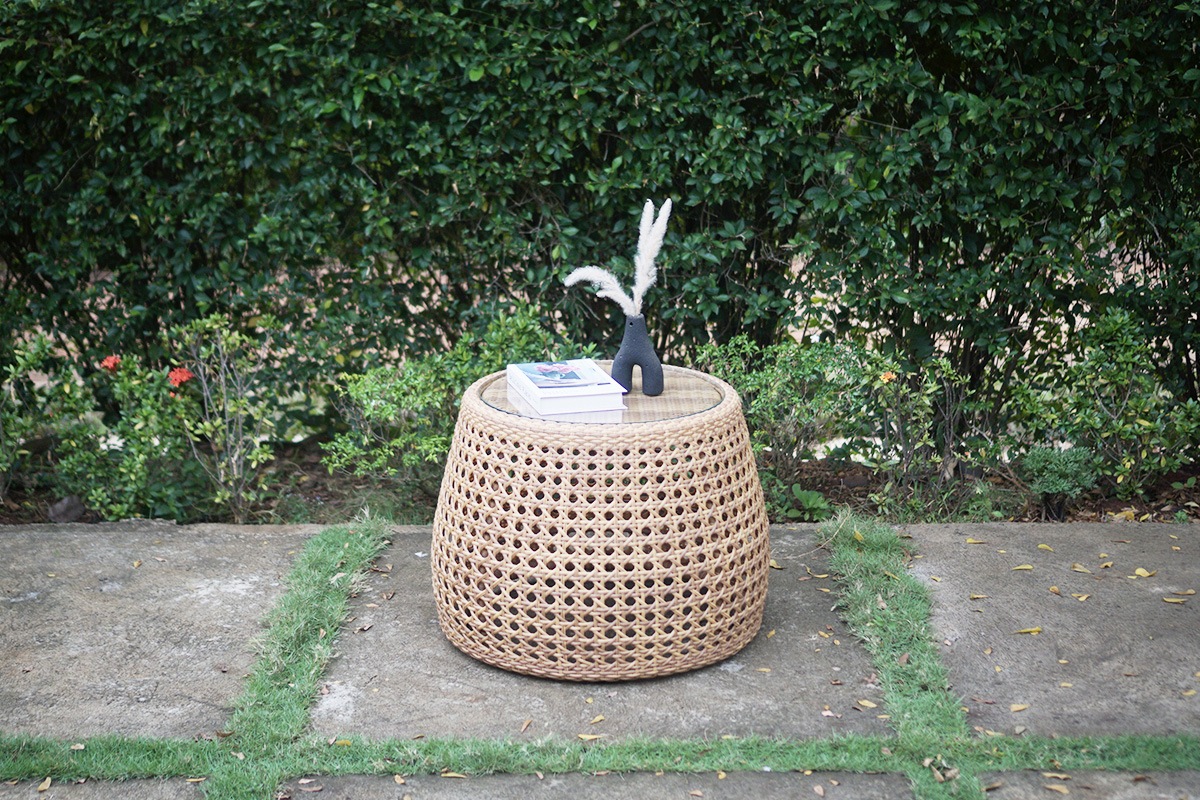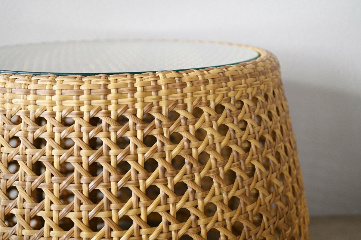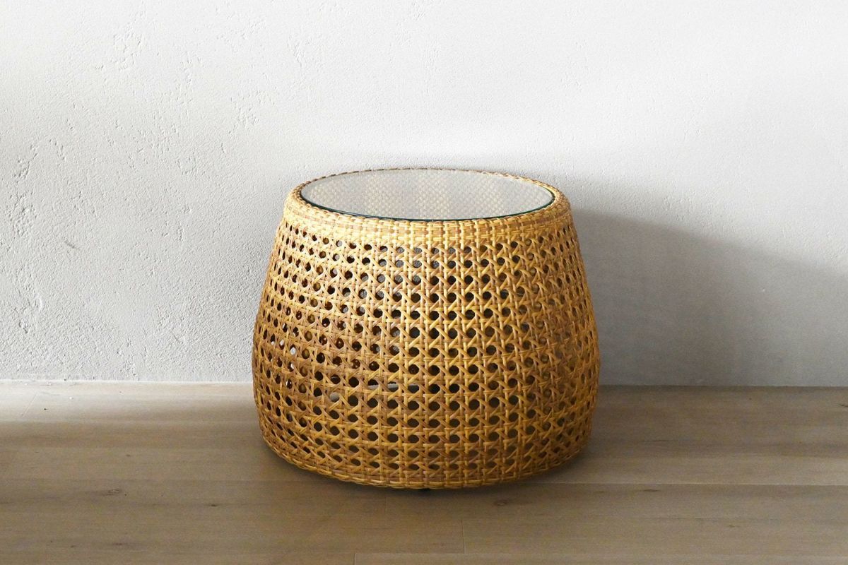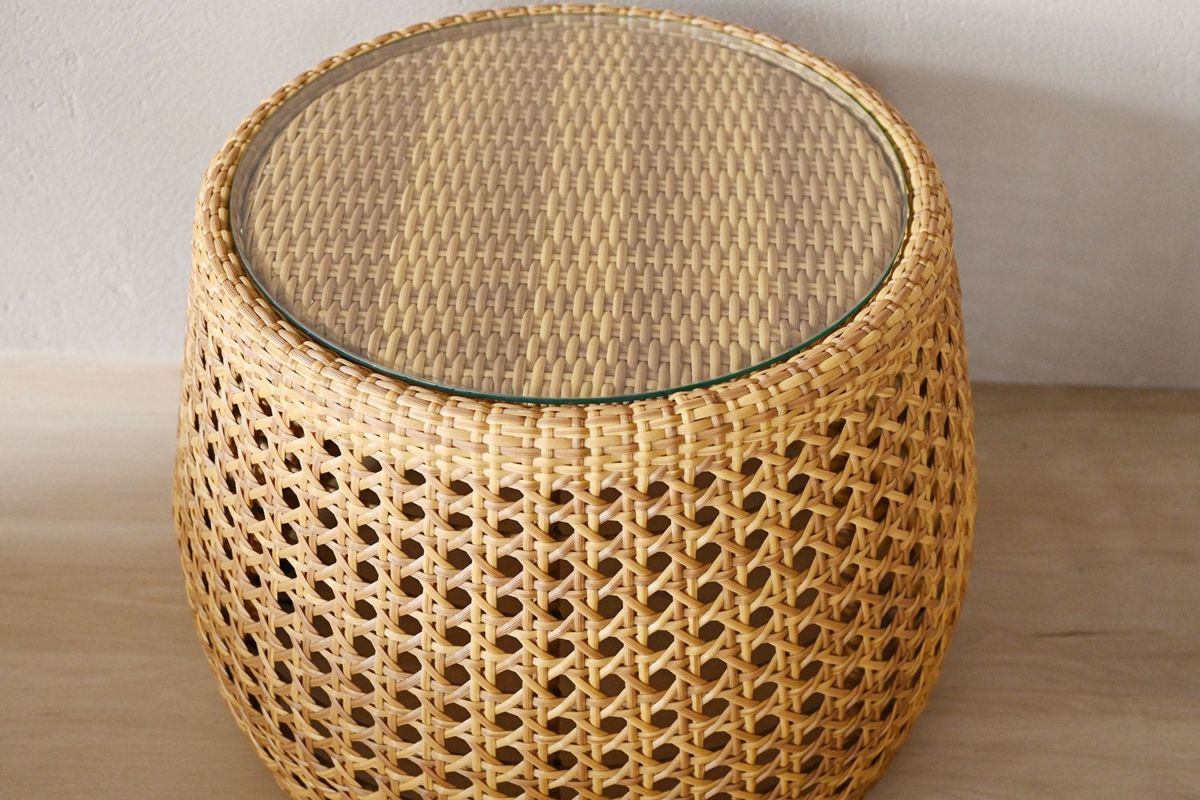 耐水性のある人工ラタンを使用しながら、伝統的な籐家具のような編みの美しさを再現した屋内外兼用のサイドテーブルです。丸みを帯びたフォルムは、空間を柔らかく演出してくれます。天板はガラス製なので、安定感がありお手入れも簡単です。