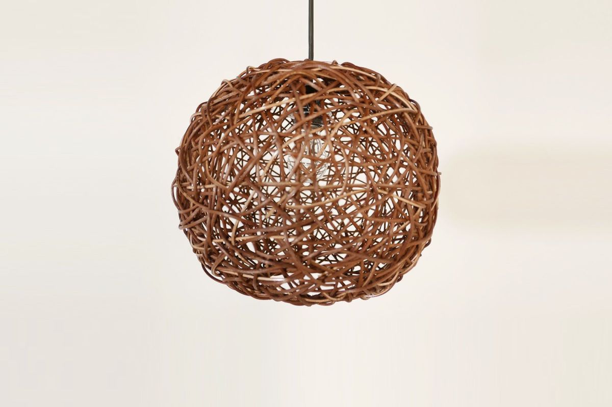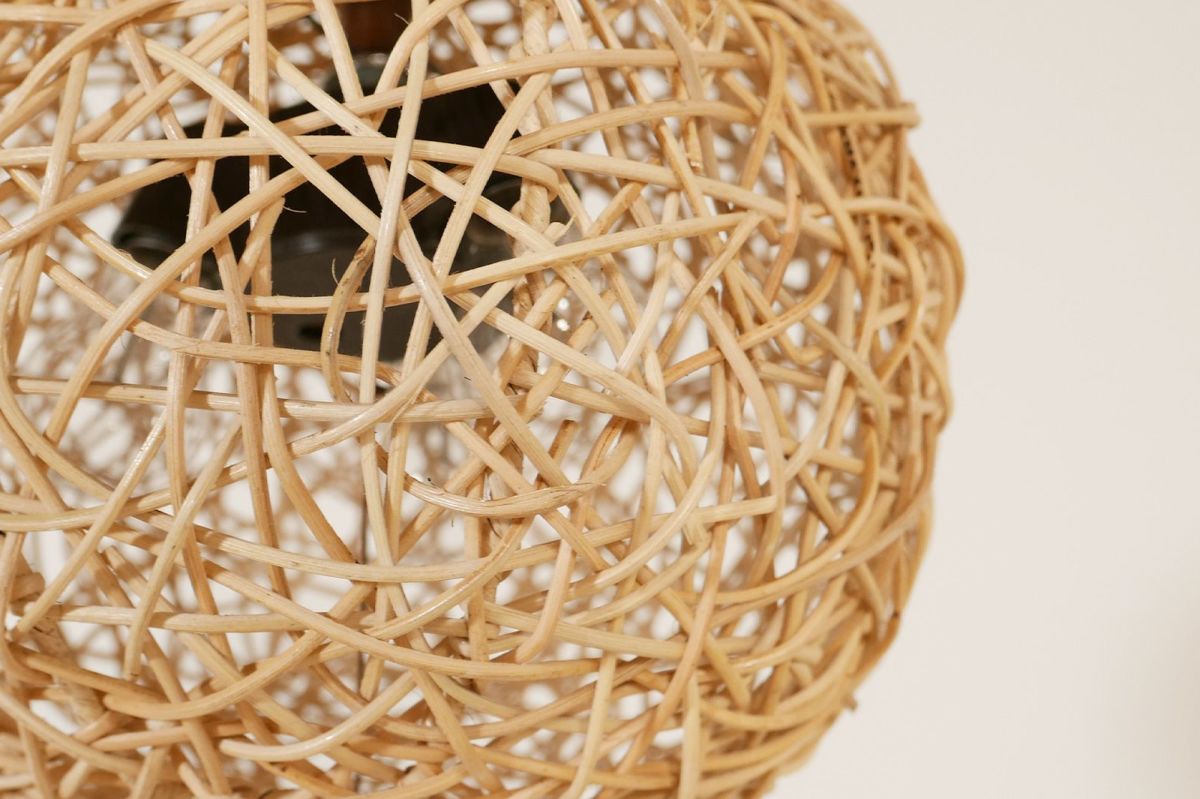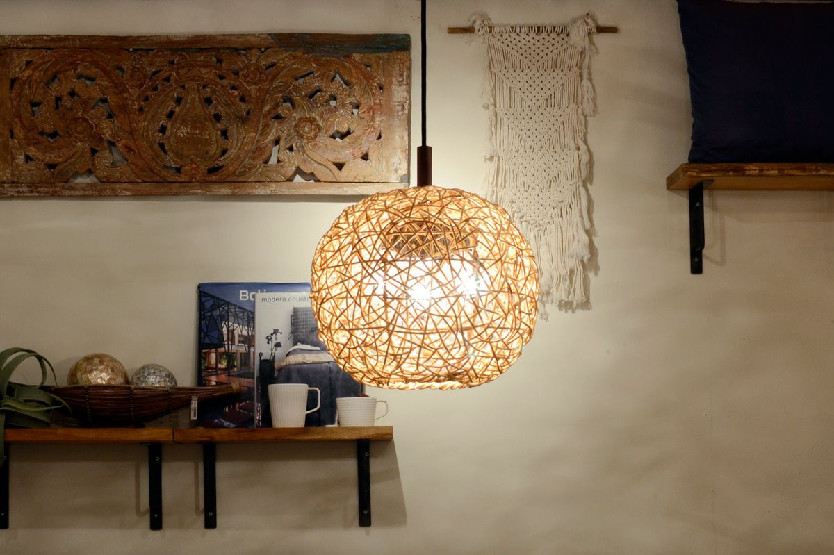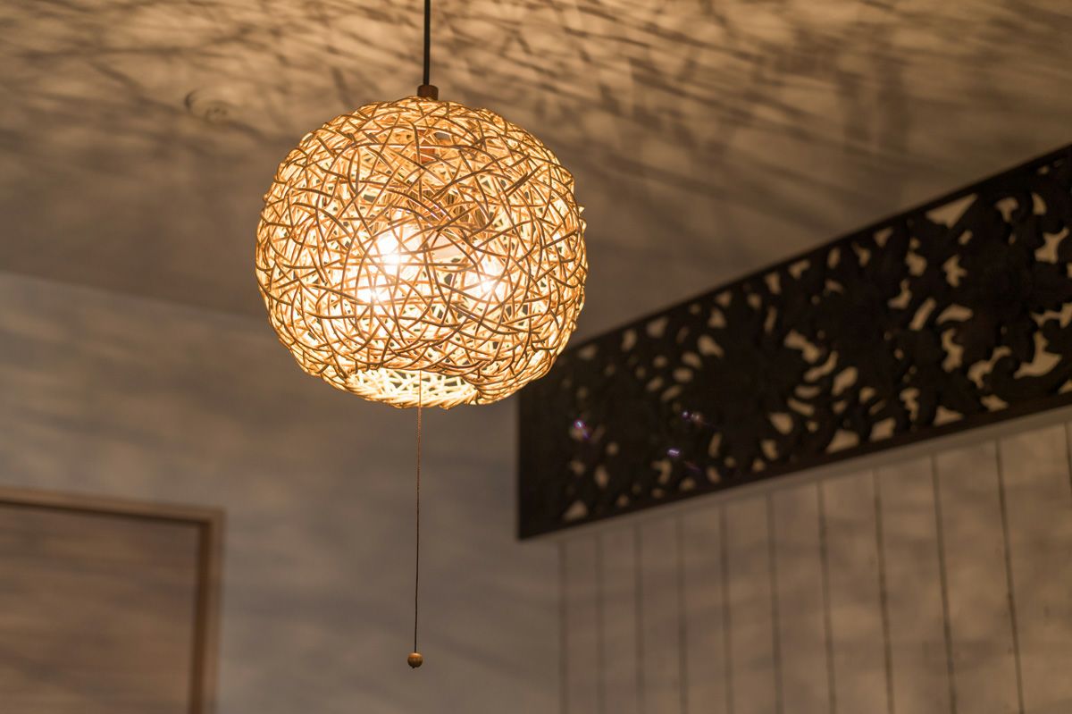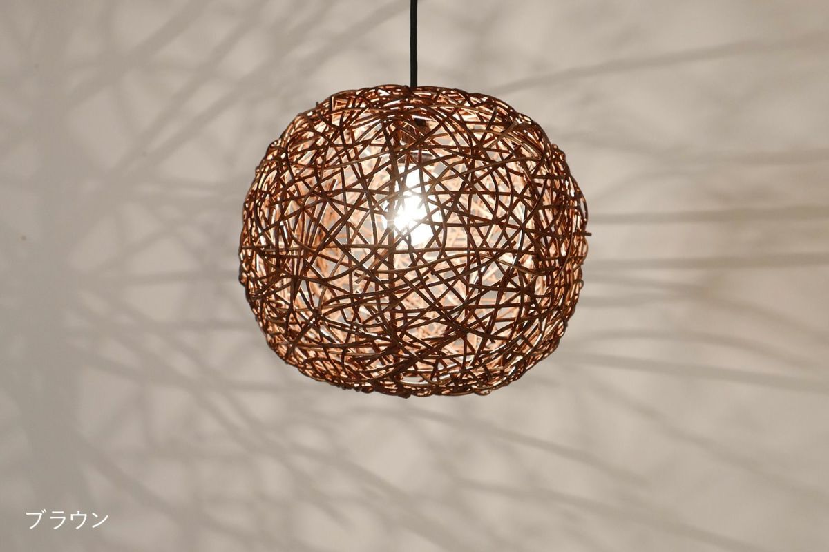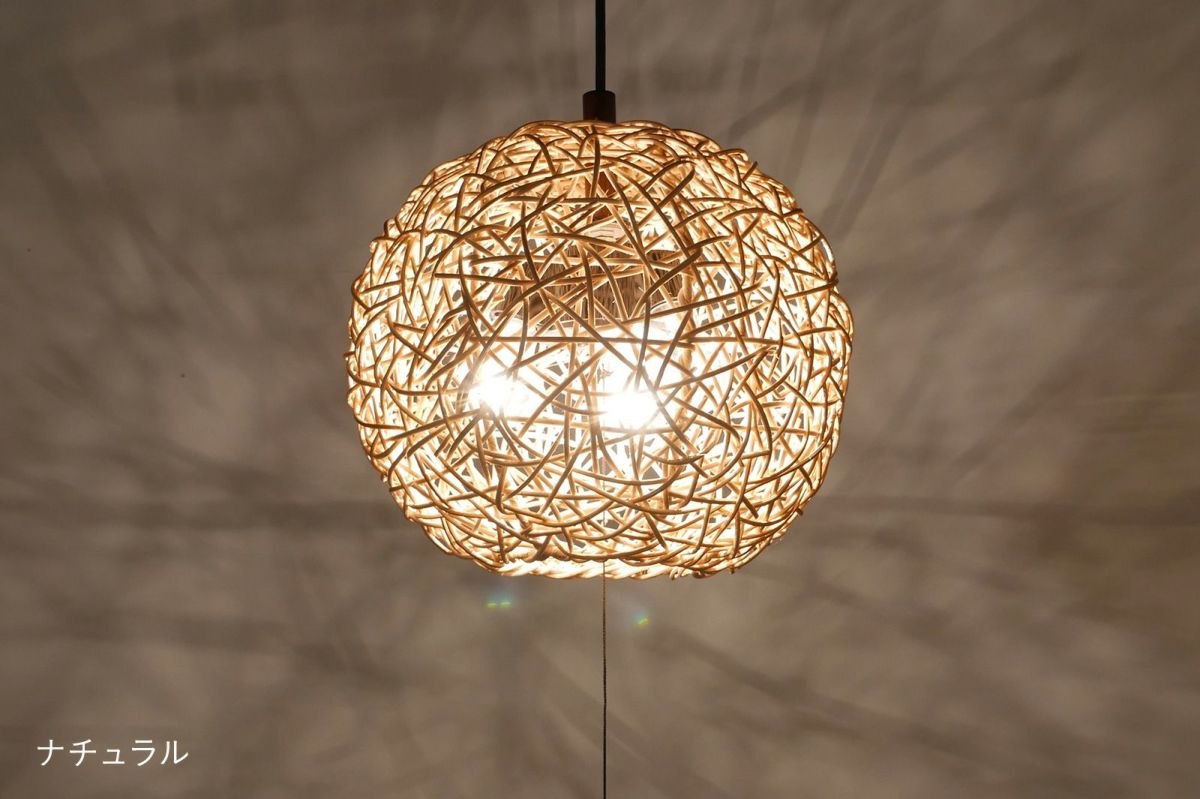 シェードの編み目から空間全体に光が広がり、その陰影がとてもきれいです。職人の手作業でひとつひとつ丁寧に作られるシェードは、ハンドメイドのぬくもりを感じさせる仕上がりです。癒しの空間にぴったりなやわらかな光を堪能いただけます。