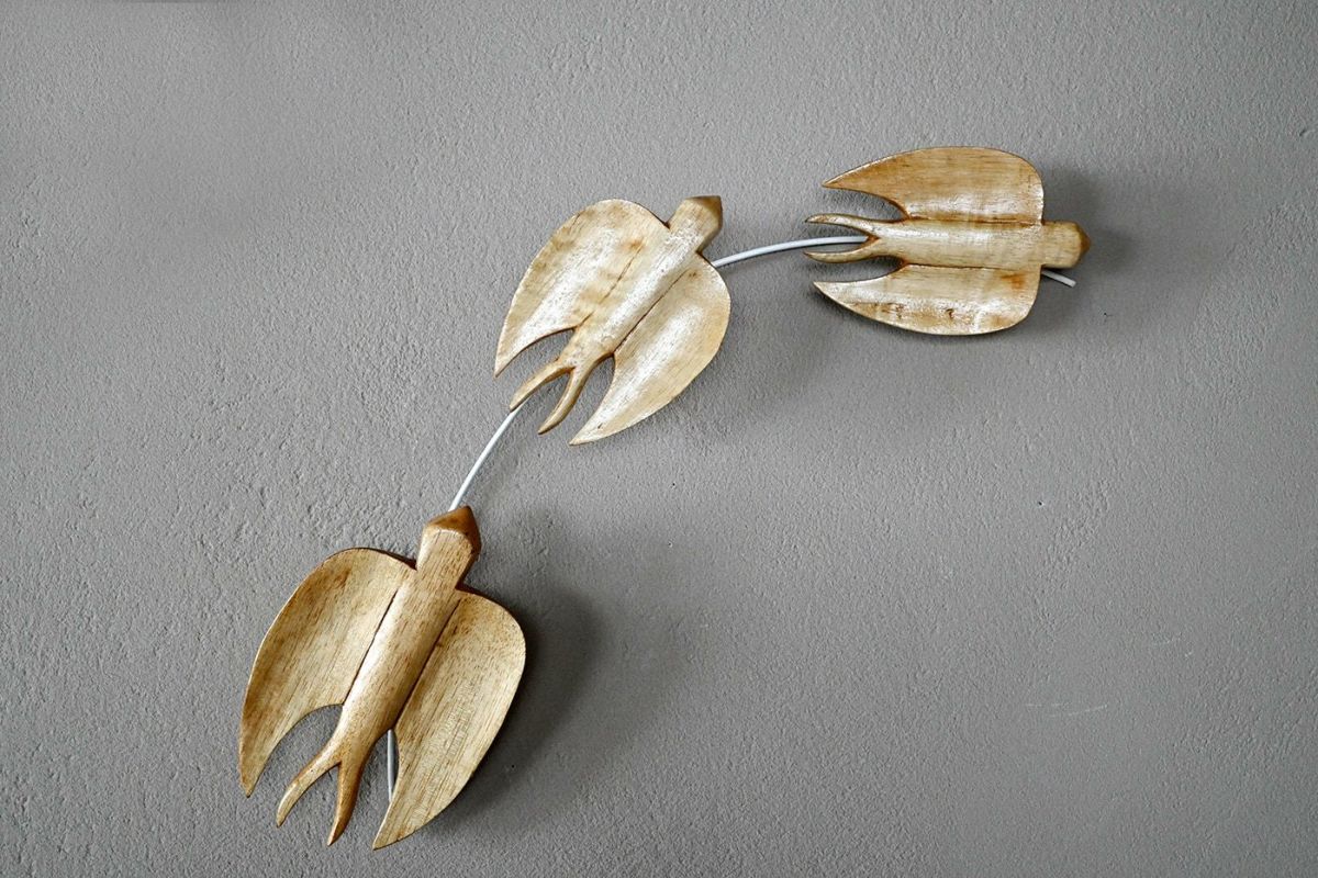 ツバメをイメージした鳥の壁掛けオブジェです。天然木を使用してひとつひとつ作られています。「燕(つばめ)」という漢字には、鳥のツバメの意味のほかに、「くつろぐ」「やすむ」といった意味があり、家でくつろぐ様子を表す熟語にも使われます。天然木のナチュラルな雰囲気と合わさり、安心感のある印象を残します。