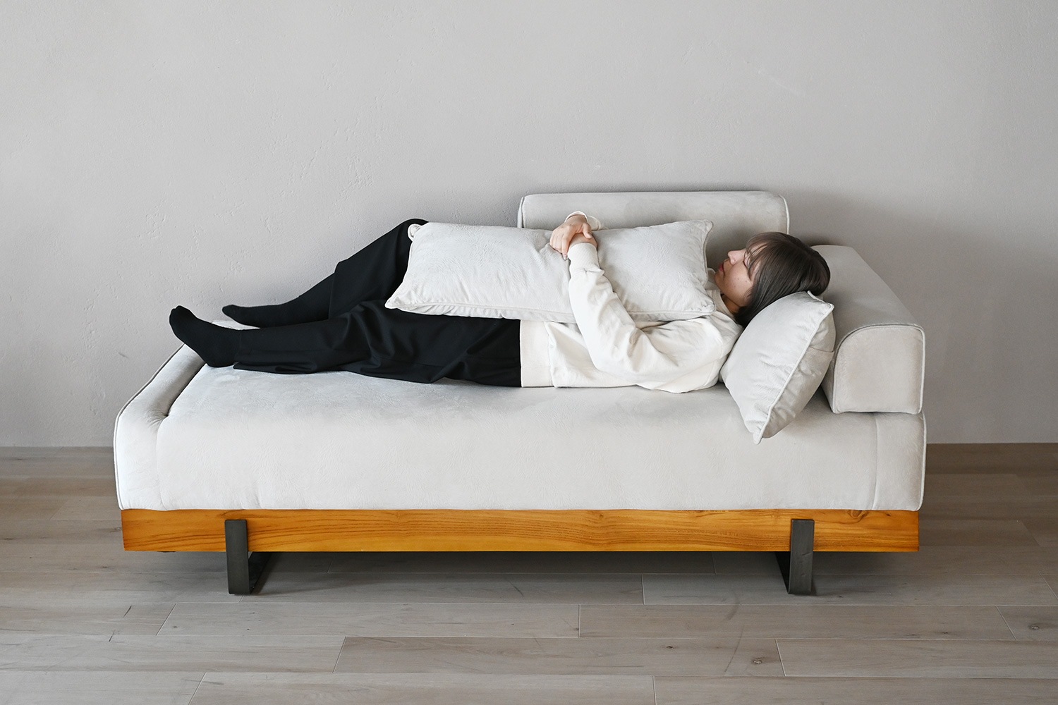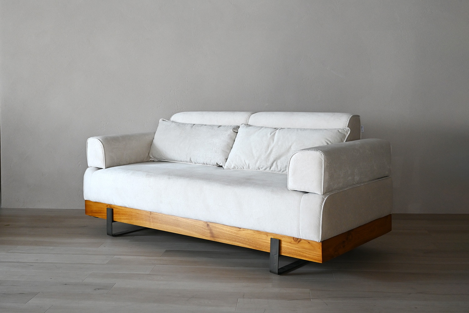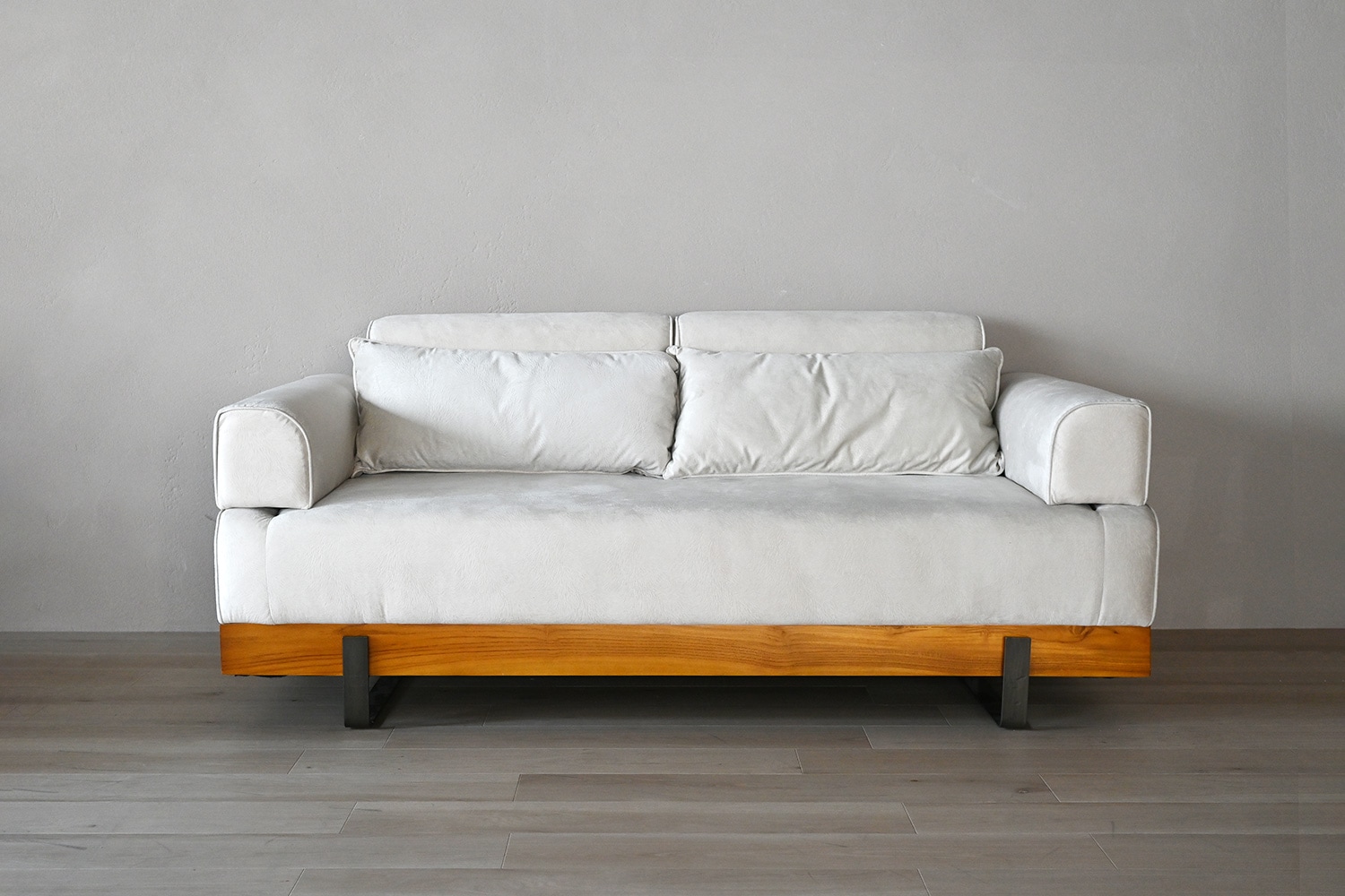 ソファのファブリックはスクラッチフリー生地。猫や犬などペットのいるご家庭におすすめの引っ掻きに強い生地です。衣類の擦れによる摩耗にも強い高い耐久性がありながら、肌触りはとてもなめらかです。 ソファベースは高級感あるチーク材を使用しています。無垢材が入ることで安定感ある印象を残し、温かみある空間をより引き立てます。