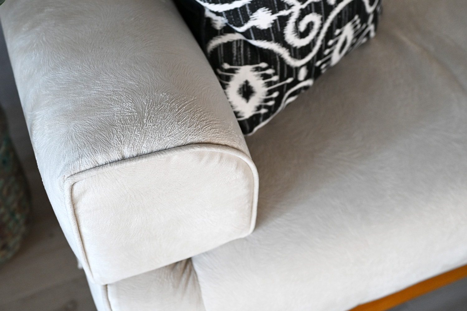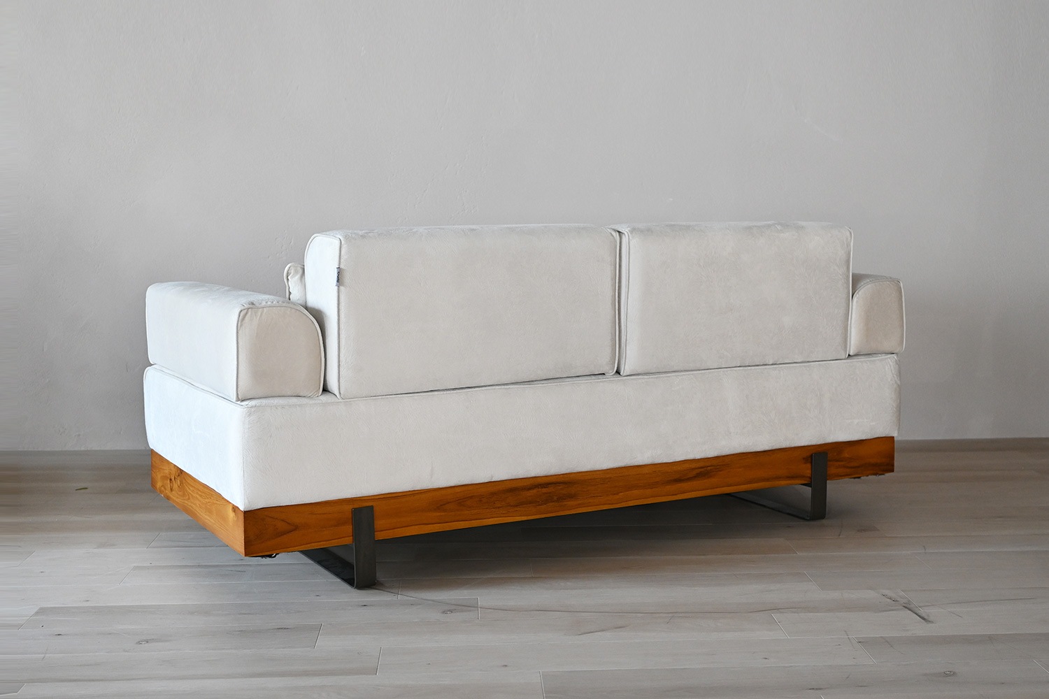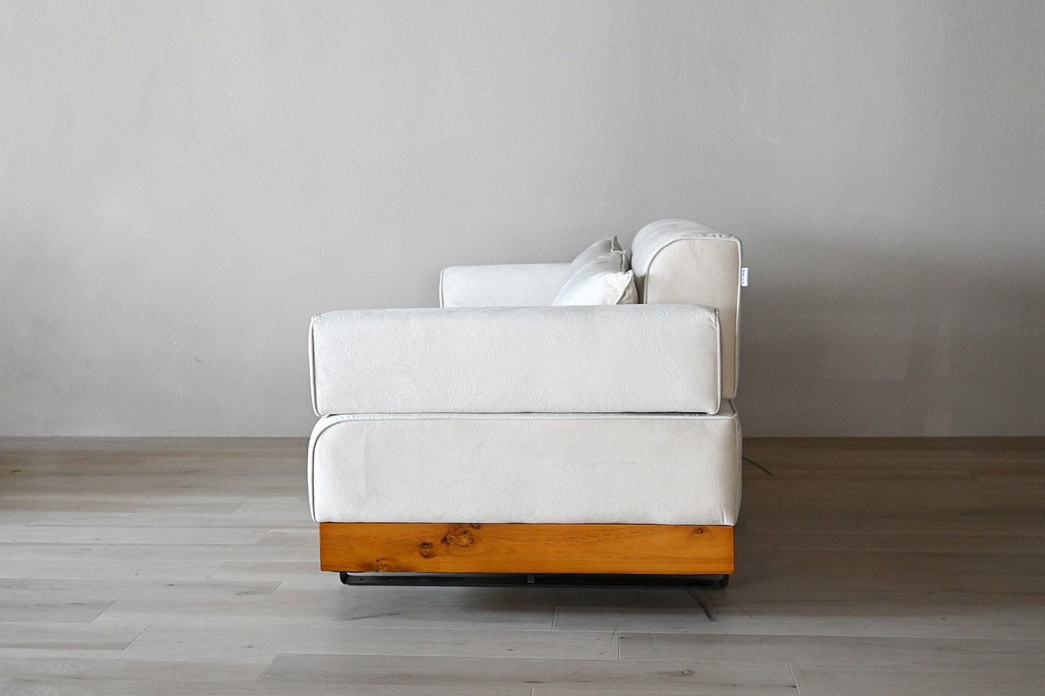 ソファのファブリックはスクラッチフリー生地。猫や犬などペットのいるご家庭におすすめの引っ掻きに強い生地です。衣類の擦れによる摩耗にも強い高い耐久性がありながら、肌触りはとてもなめらかです。 ソファベースは高級感あるチーク材を使用しています。無垢材が入ることで安定感ある印象を残し、温かみある空間をより引き立てます。