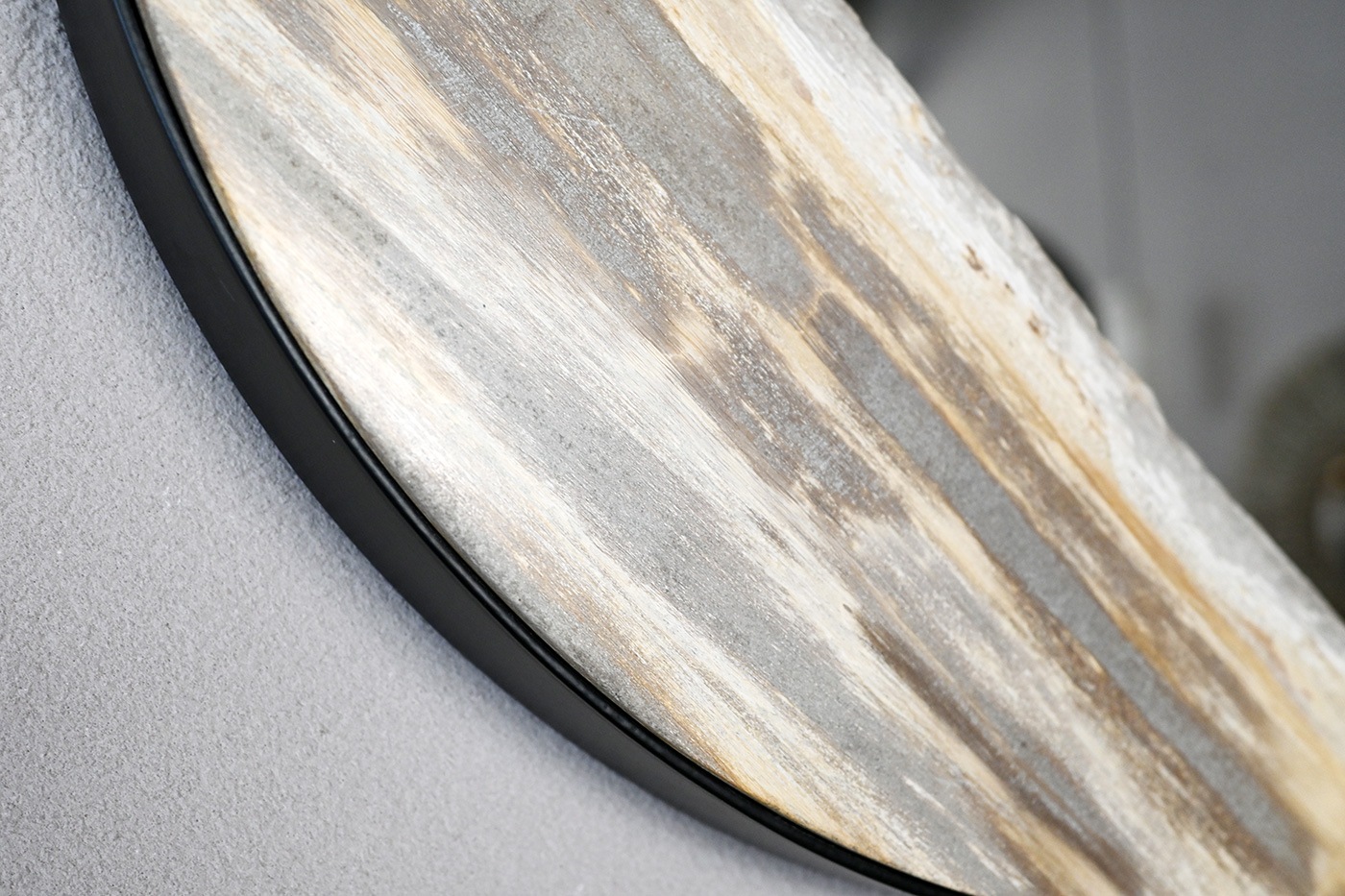 木化石は鉱物でありながら木の風合いを残す不思議な魅力のある素材で、今インテリアとして注目されています。そんな木化石をフレームの一部にデザインした壁掛けのミラーです。自然が生み出す芸術的な模様がアクセントになっています。