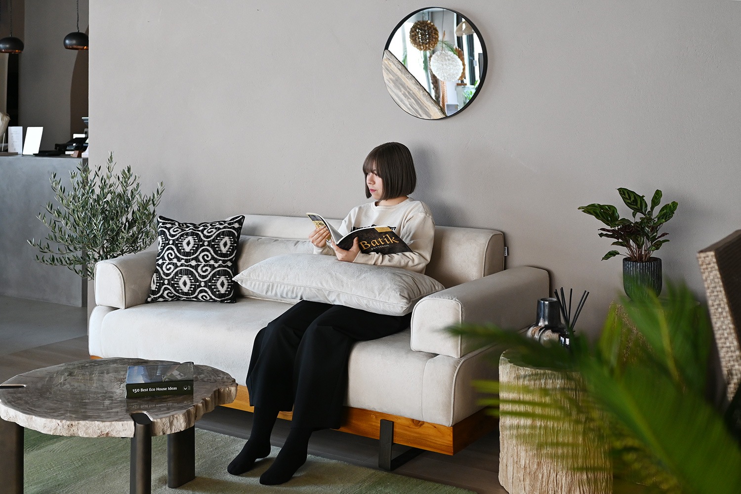 フレームの黒が空間をスタイリッシュに引き締め、モダンスタイルやモノトーンのインテリアなど洗練されたインテリアスタイルによく合うミラーです。直線的な家具が多い中で丸いフォルムは、空間のアクセントとして活用できます。