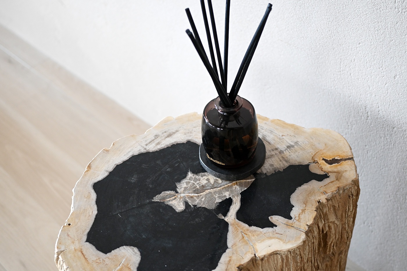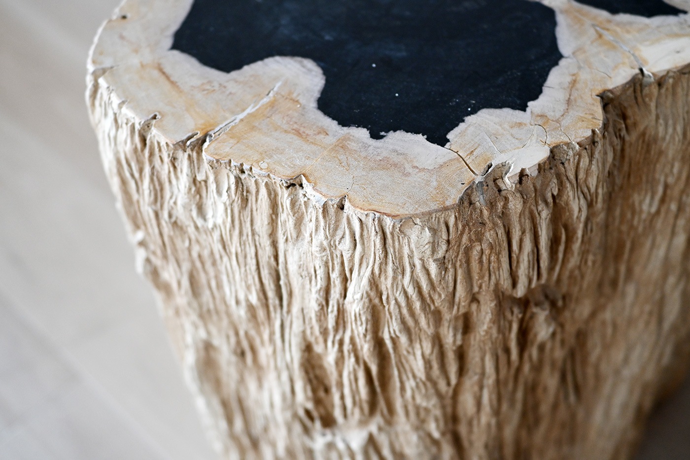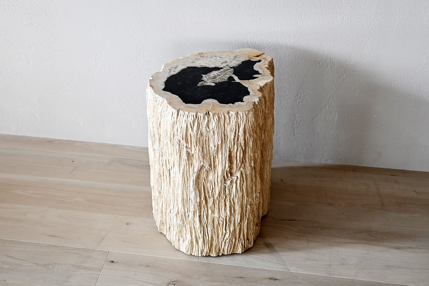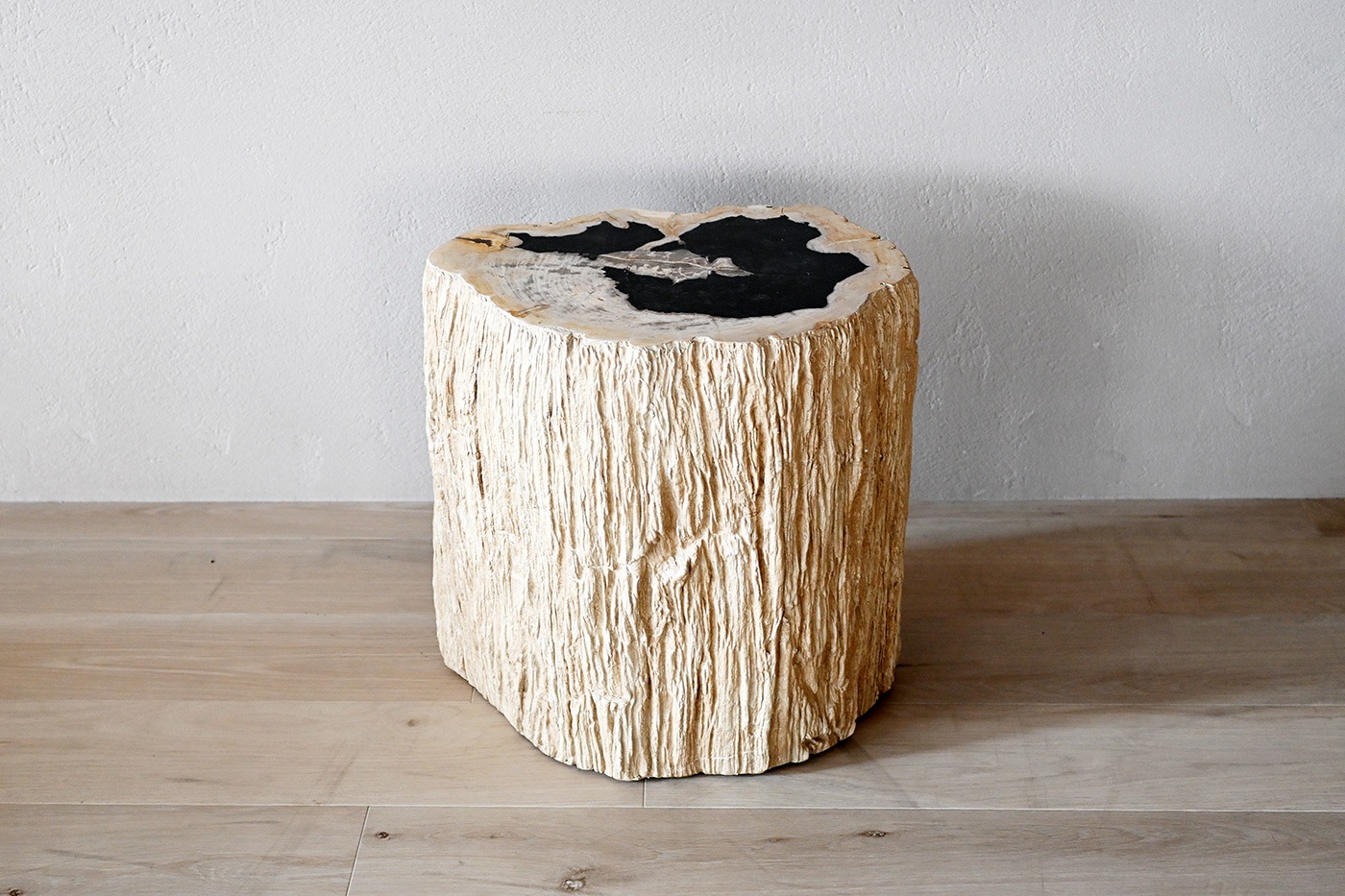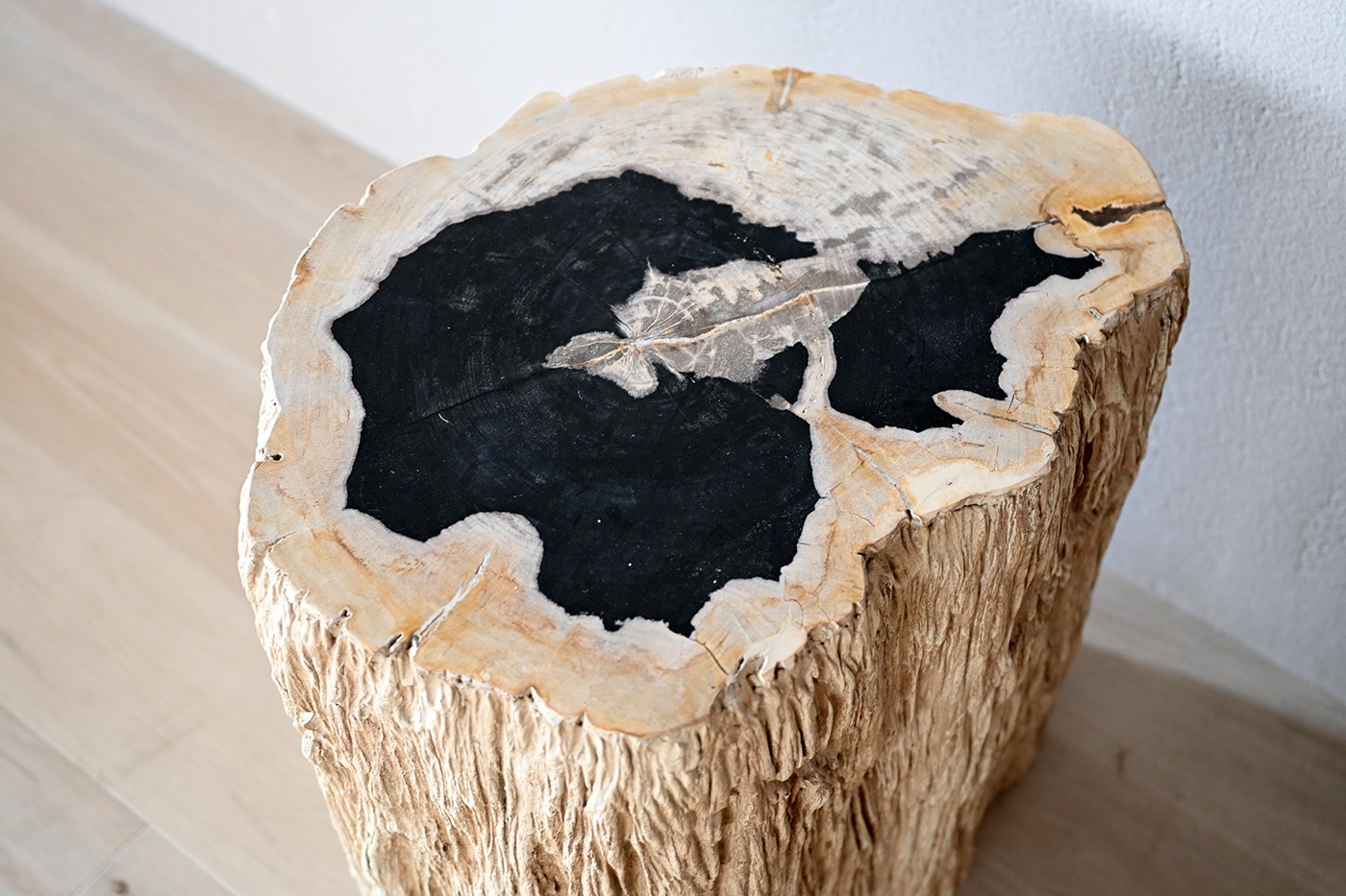 木化石は鉱物でありながら木の風合いを残す不思議な魅力のある素材で、今インテリアとして注目されています。そんな木化石を大胆に採用したサイドテーブルです。数百年の時を経て形成される木の化石。自然が生み出す芸術的な模様と色合いを存分に楽しむことができるテーブルです。