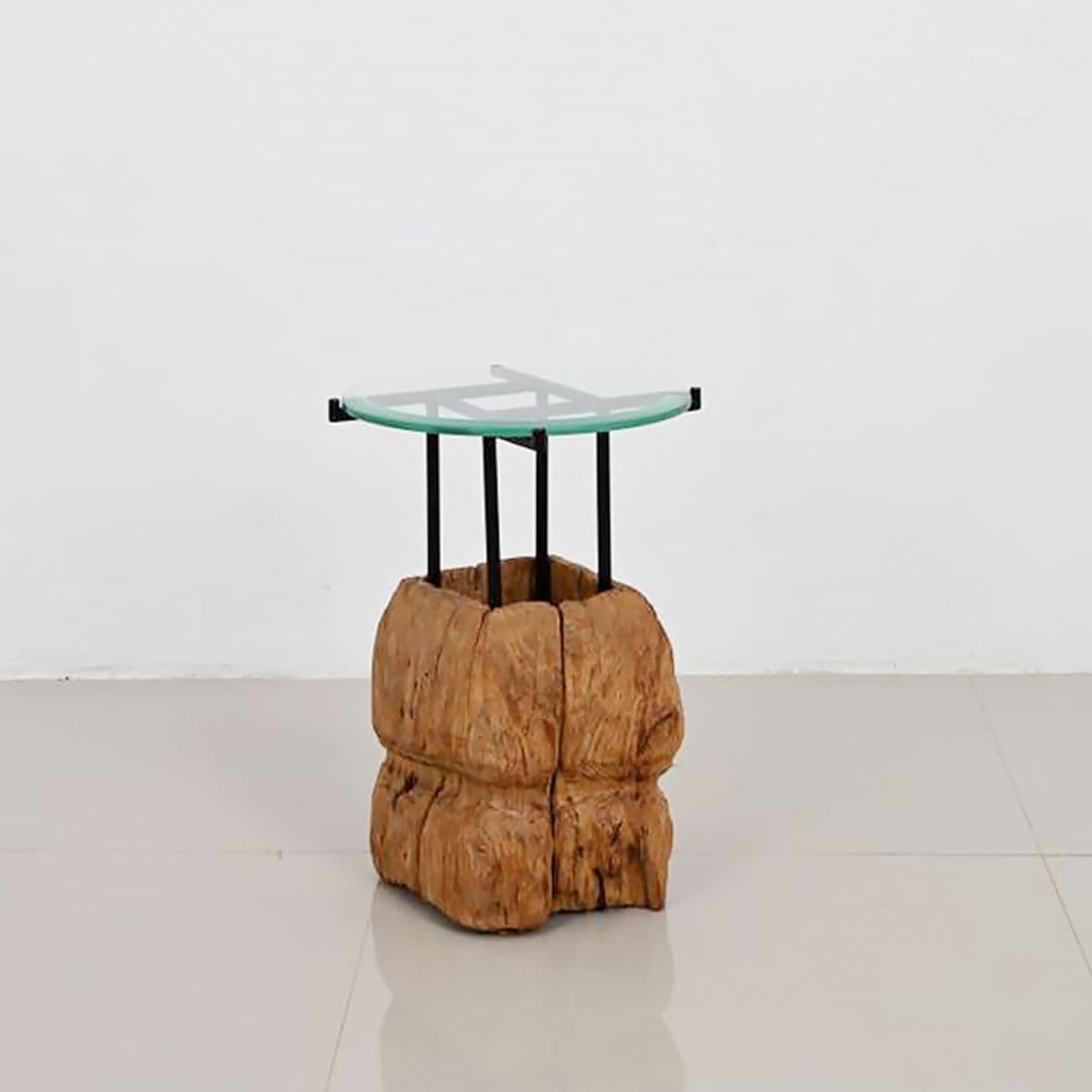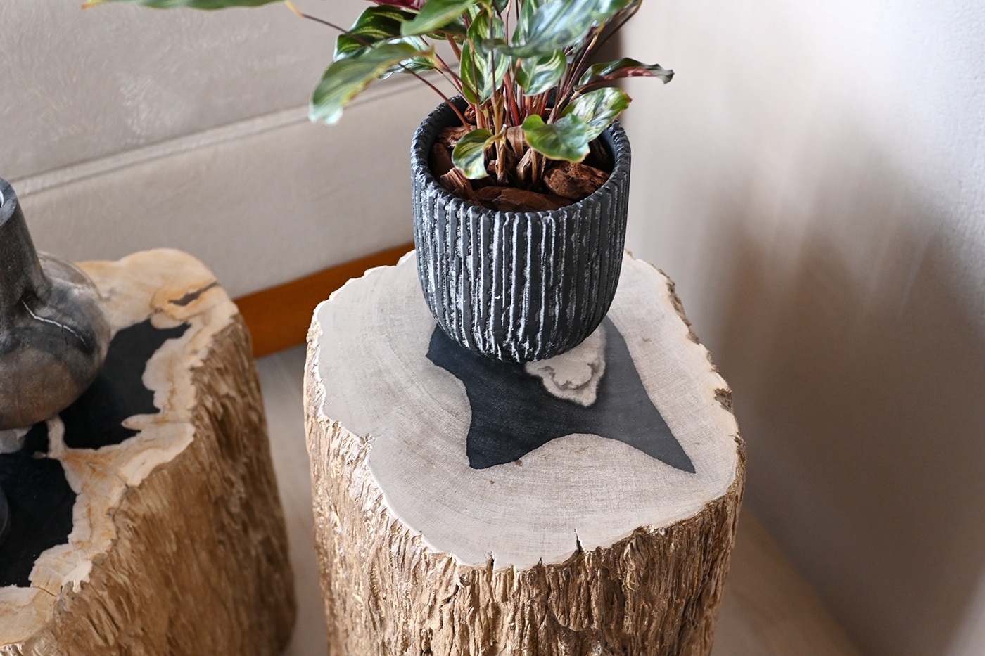 ダイナミックな自然の美しさを活かした潔いデザインです。切り株のように見えるサイドのデザインも鉱物の質感によりラグジュアリーな雰囲気となり、独特の存在感を放ちます。少し高さのあるテーブルなので、観葉植物や卓上ランプを飾る台として高さを出したい時に便利です。