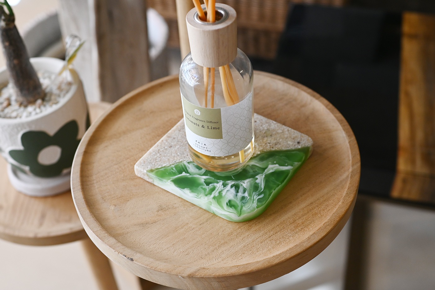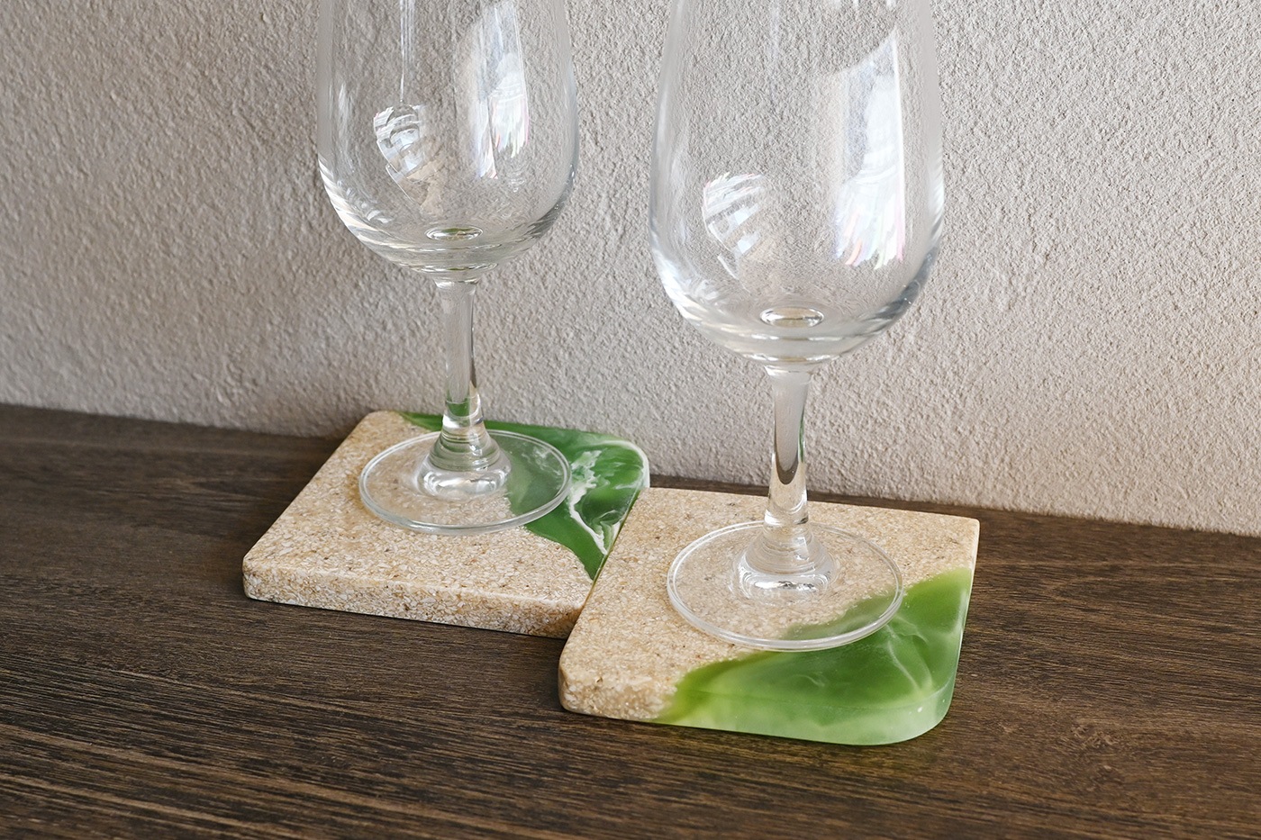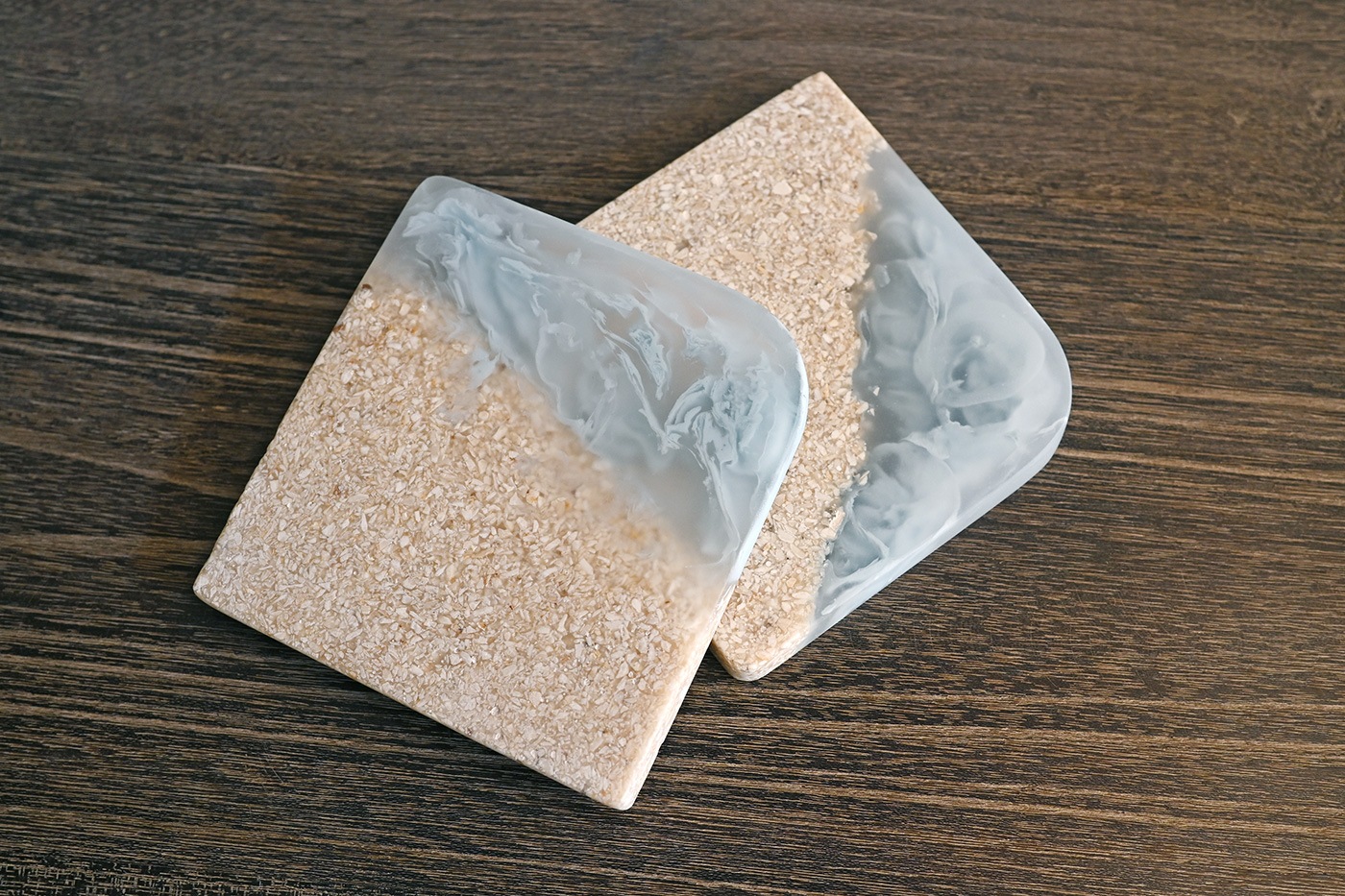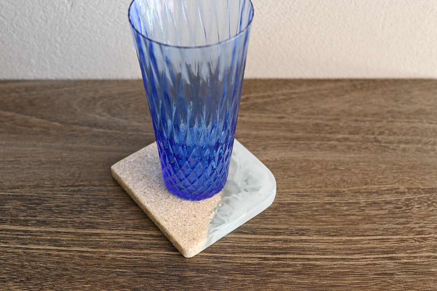 爽やかな海のイメージが広がるコースターです。使いやすいスクエアタイプ。テーブル以外でも細身のフラワーベースと組み合わせたり、小さなオブジェを置いてみたり、インテリアのアクセントとしてもおすすめです。ひとつひとつ模様の入り方は異なりますが、異なる表情のデザインも魅力のひとつとしてお楽しみください。