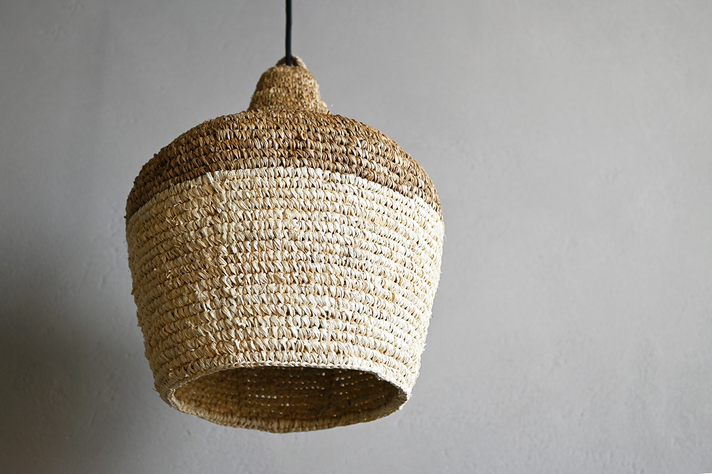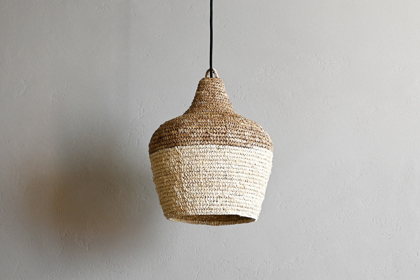 ざっくりとした編みのシェードが素朴でやさしい印象を与えるペンダントランプです。編み目から漏れる柔らかな光が空間を照らします。ひとつひとつ手編みで作られるシェードは天然素材の繊維を使用しています。ハンドメイドならではのフォルムや色味の個体差も魅力のひとつです。