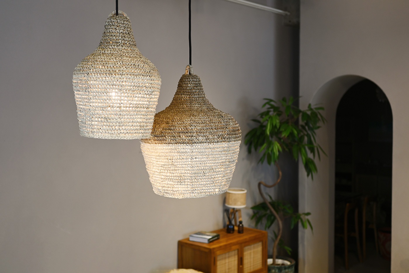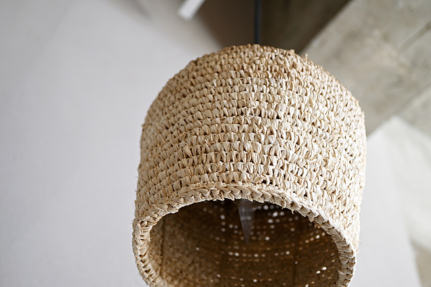 ざっくりとした編みのシェードが素朴でやさしい印象を与えるペンダントランプです。ボトルネックのようなフォルムのシェードから柔らかな光が空間を照らします。ひとつひとつ手編みで作られるシェードは天然素材の繊維を使用しています。ハンドメイドならではのフォルムや色味の個体差も魅力のひとつです。