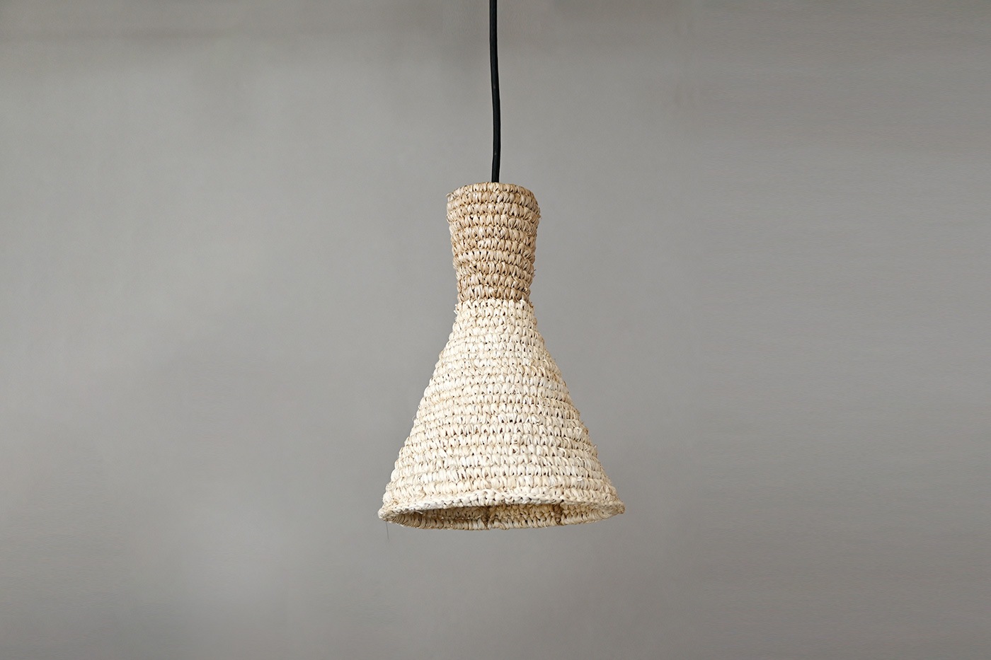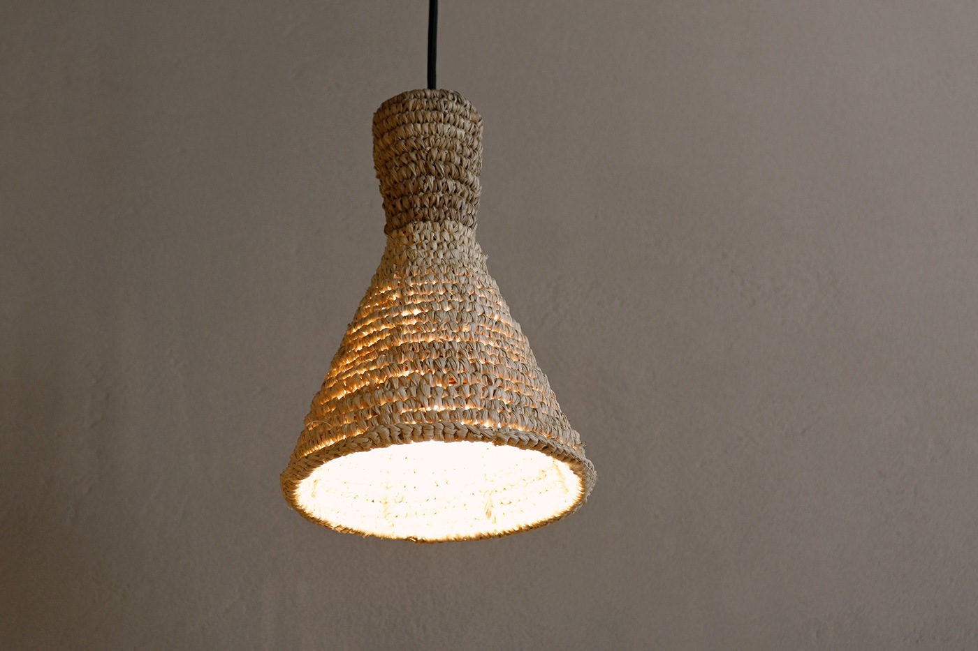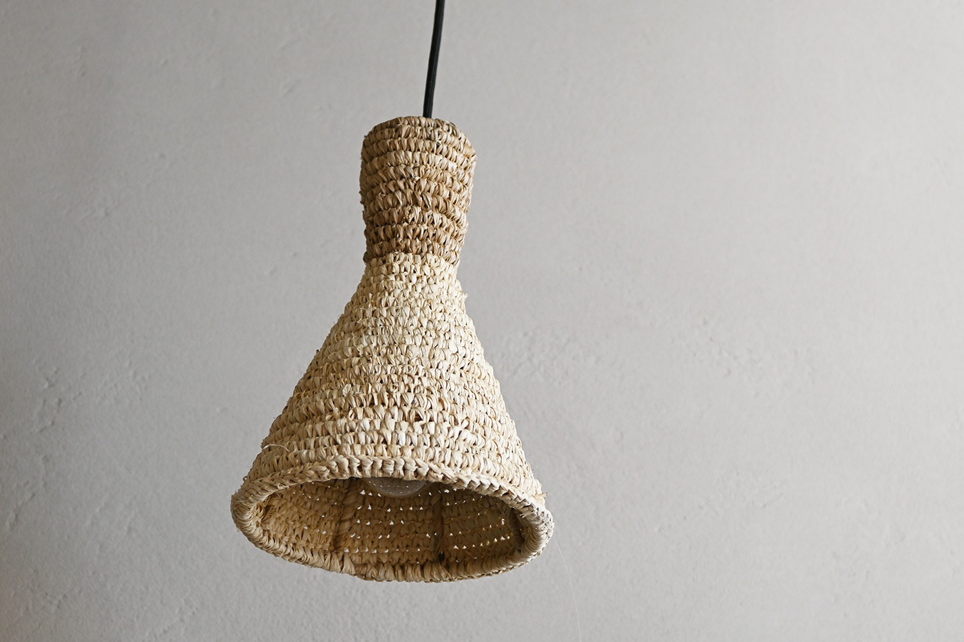 ざっくりとした編みのシェードが素朴でやさしい印象を与えるペンダントランプです。小さめのコーン型がかわいらしいSサイズ。編み目から漏れる柔らかな光が空間を照らします。ひとつひとつ手編みで作られるシェードは天然素材の繊維を使用しています。ハンドメイドならではのフォルムや色味の個体差も魅力のひとつです。