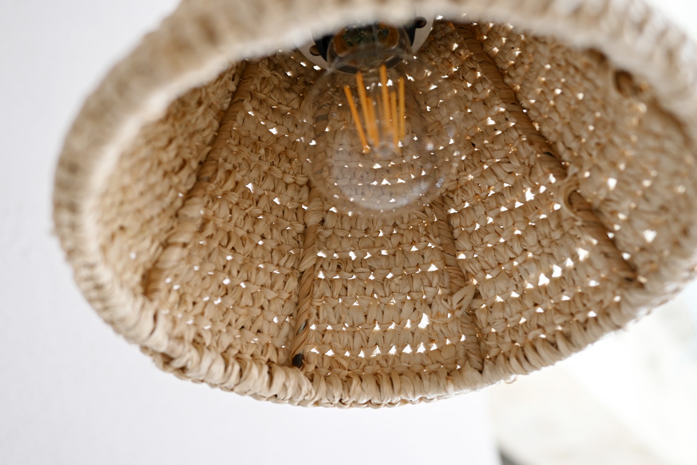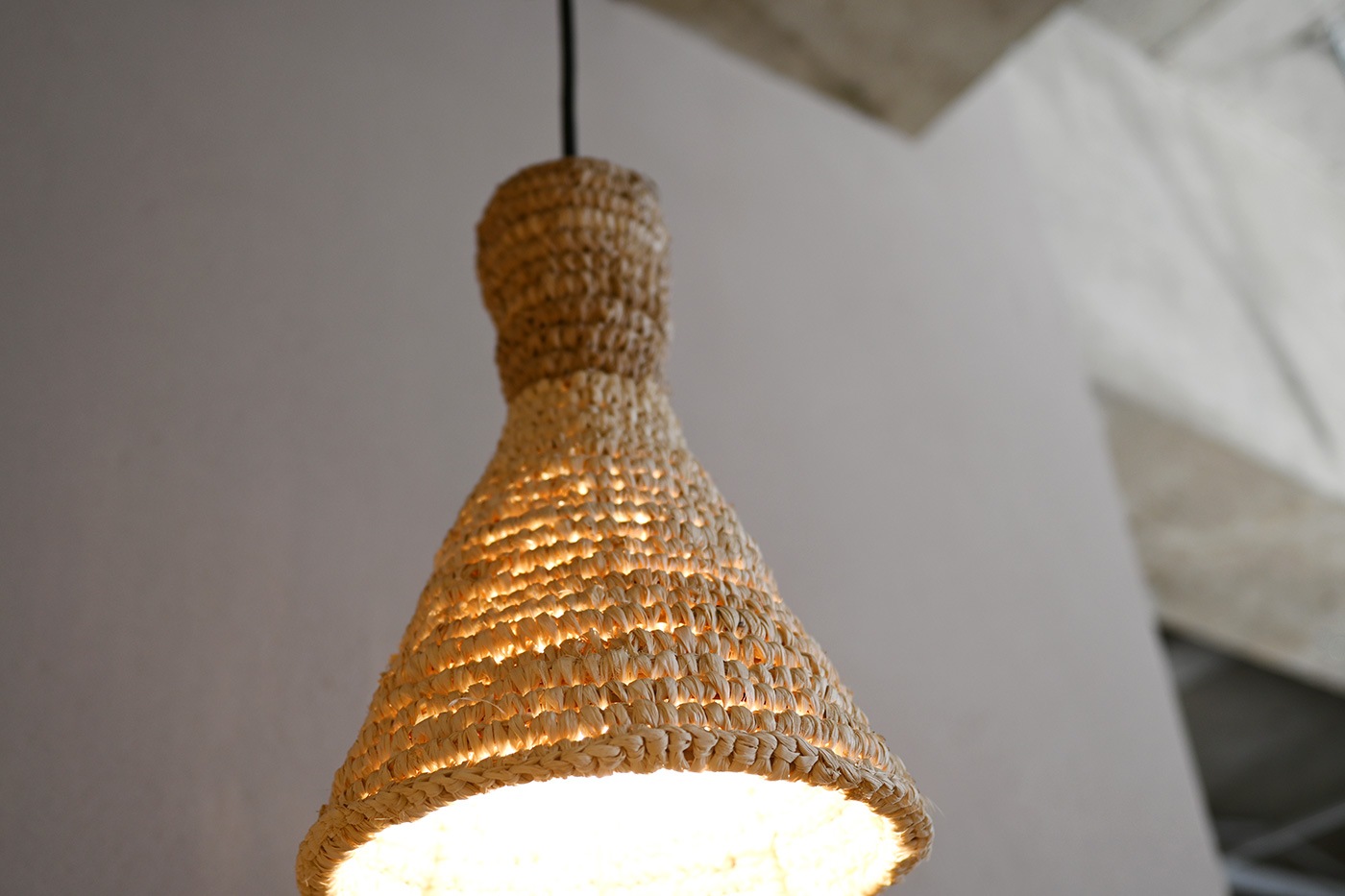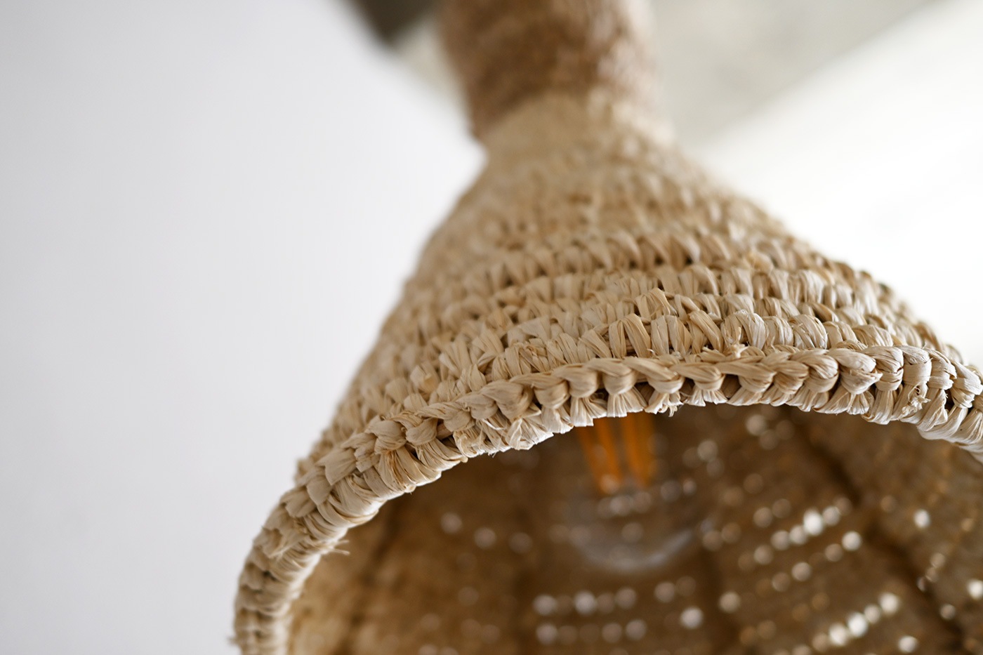 ざっくりとした編みのシェードが素朴でやさしい印象を与えるペンダントランプです。小さめのコーン型がかわいらしいSサイズ。編み目から漏れる柔らかな光が空間を照らします。ひとつひとつ手編みで作られるシェードは天然素材の繊維を使用しています。ハンドメイドならではのフォルムや色味の個体差も魅力のひとつです。